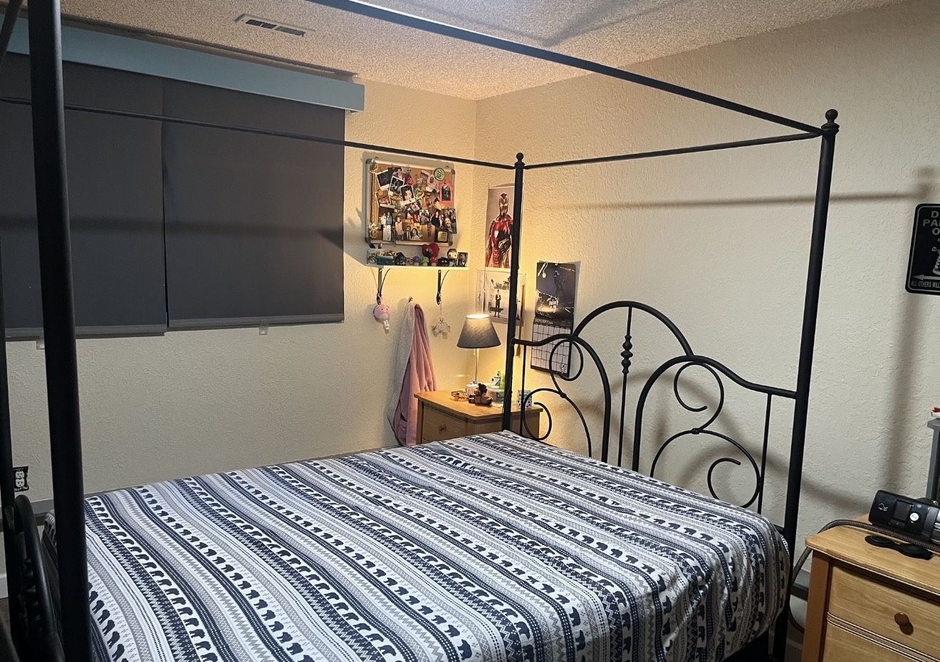 Iron bed frame Queen size. Come with all the attachments like the top bar rails where you could put the bed curtain. Bed not included but if you need a box spring I could include that too.