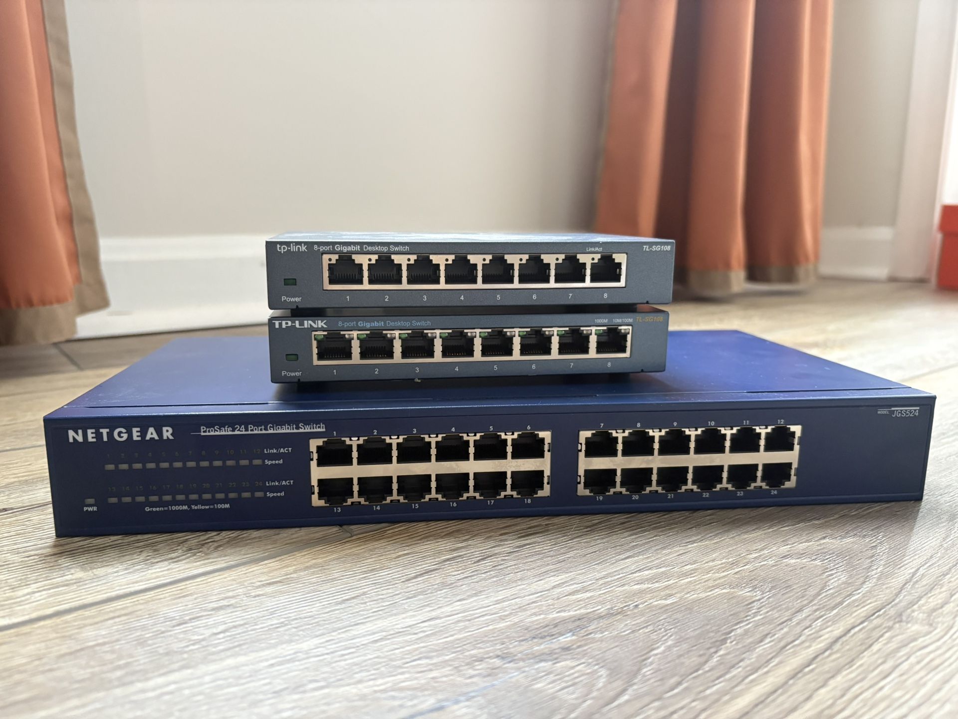 Upgrade your network with this high-performance switch bundle, perfect for small businesses, home offices, or anyone looking to expand their wired network quickly and affordably. All items are gently used, fully functional, and tested for reliable performance. 🔧 What's Included: 1 x Netgear ProSafe 24-Port Gigabit Switch (Model: JGS524) 24 auto-sensing Gigabit ports for lightning-fast wired connections Sturdy metal housing, fanless for silent operation Ideal for connecting multiple workstations, servers, printers, or NAS devices 2 x TP-Link 8-Port Gigabit Desktop Switch (TL-SG108) Compact, plug-and-play design—no configuration required Durable metal casing for long-lasting use Energy-efficient and ultra-quiet, perfect for a desk or small office setup 💼 Who Is This For? This networking bundle is perfect for: Small business owners looking to expand their network without breaking the bank Home users building a more robust network for gaming, streaming, or smart home devices IT hobbyists or tech-savvy individuals looking to upgrade from Wi-Fi to stable wired connections 💰 Price & Condition All units are in excellent working condition, lightly used Sold as a bundle only for a great deal—message for pricing or to make an offer! Local pickup preferred (can meet in a public place) Cash Only! 📩 Contact Send a message if you’re interested or have questions. First come, first served—don’t miss this great deal on reliable networking gear!