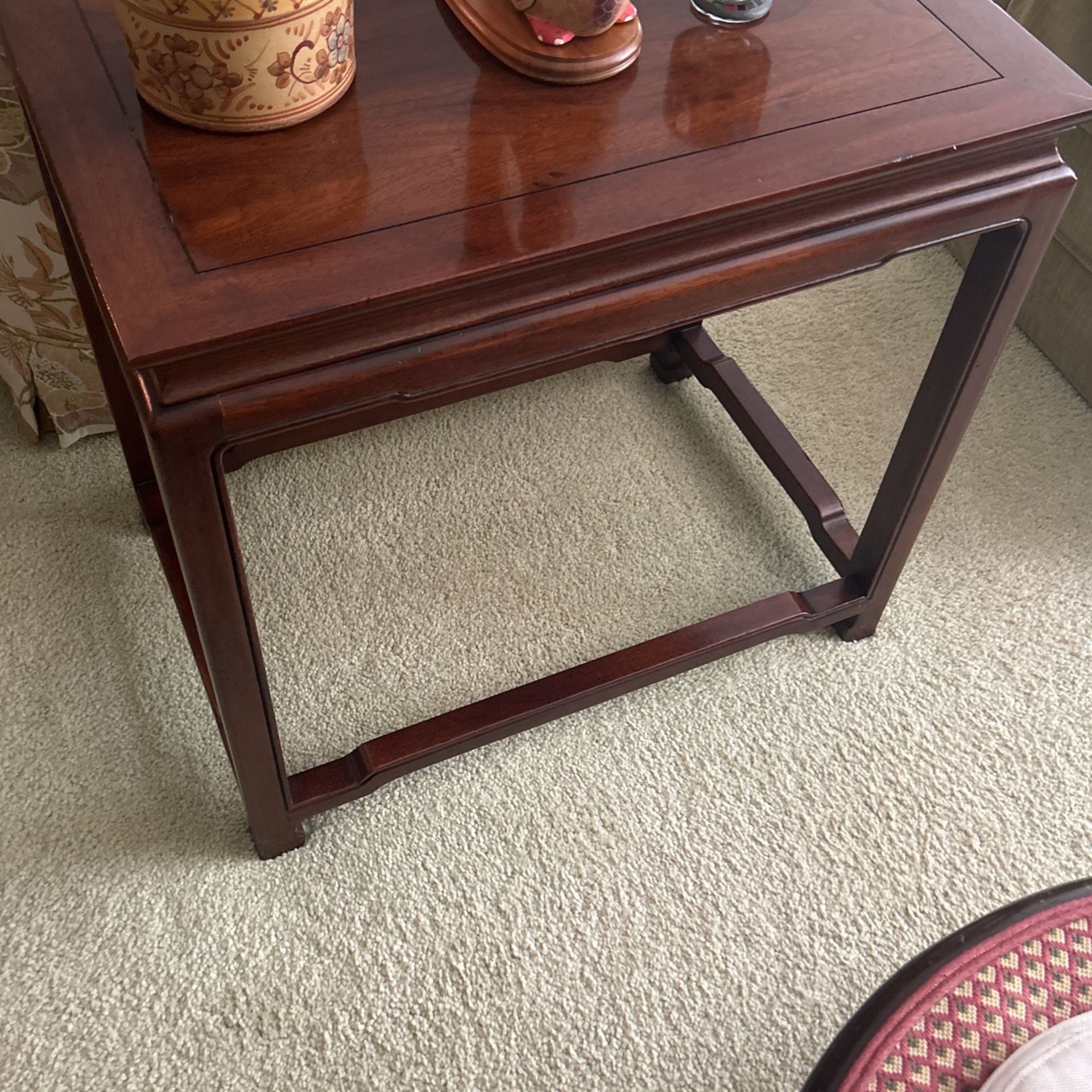 Gorgeous wood side table with glossy sheen made of solid wood. Beautiful details. In excellent condition. 28” wide x 19” deep x 26” tall