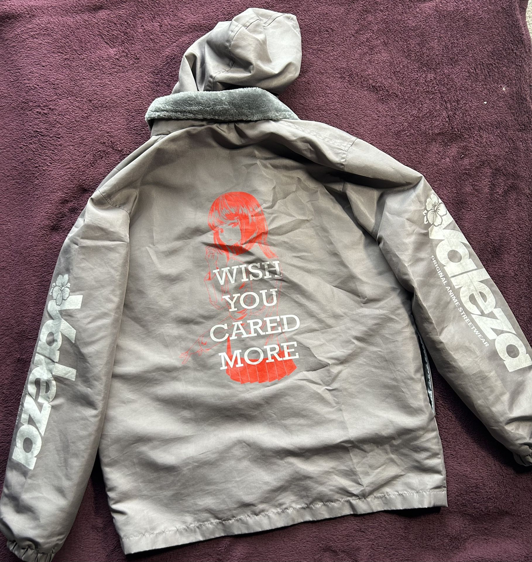 🔥 Rare Valeza anime-style jacket with faux fur lining and bold graphic on back. Size Medium – Grey with red/white detailing Quote on back: “Wish You Cared More” 🖤 Streetwear, cosplay, and anime fans will love this! Great condition. Ready to rock.