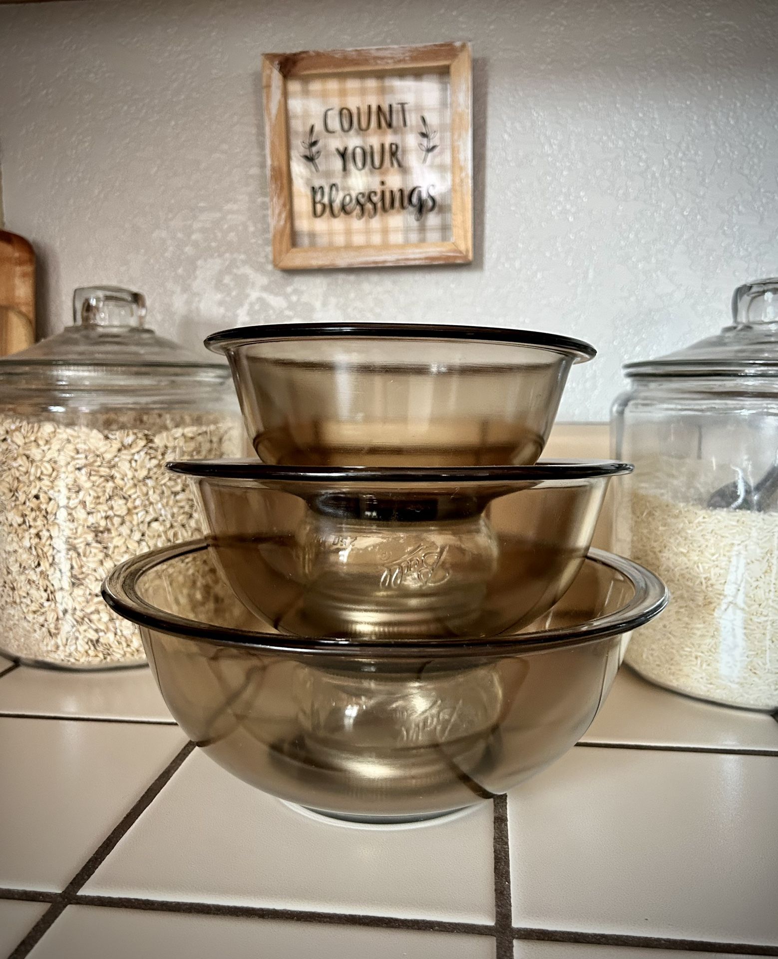 Vintage Pyrex Amber Brown Glass Nesting Mixing Bowls Set of 3 Numbers 322, 323, and 325. Made in USA. Underside says ‘Safe for Oven & Microwave’ The smallest bowl is approximately 7" in diameter and holds 1.0 L. The medium bowl is approximately 8.5" in diameter and holds 1.5 L. The large bowl is approximately 9 7/8” in diameter and holds 2.5 L. All have scratches and I found one small chip on the rim of the smallest. Please see photos. A great addition to your Pyrex and Corning Ware collection! These bowl are super versatile and won’t take up much cabinet space with their lovely nesting design. Gorgeous amber brown color. Snag these beauties before someone else does! Feel free to browse our other available items and make an offer or bundle. Have a great day!