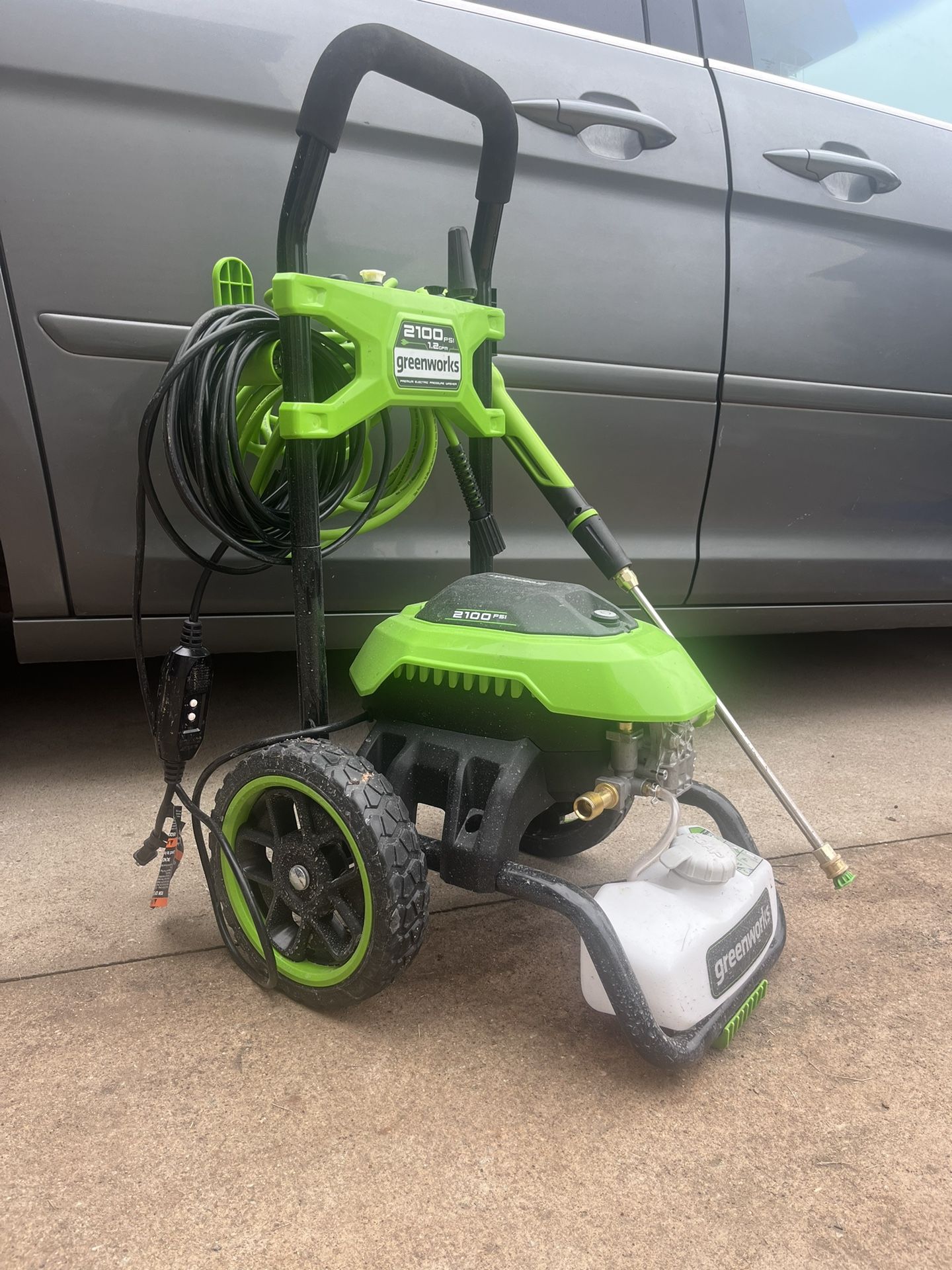Greenworks Pressure washer, 2100 psi, comes with nozzles, pressure hose, wand and original box. Normal were due to use, but in great condition