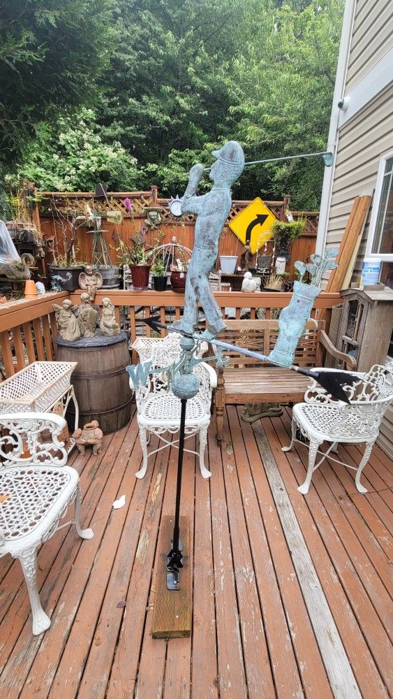 vintage Golfer ποΈββοΈ weather vane made of Cooper with adjustable roof pitch base. Condition is good. size is 32"w x 64"W Beautiful addition to garden, roof or top of shed.