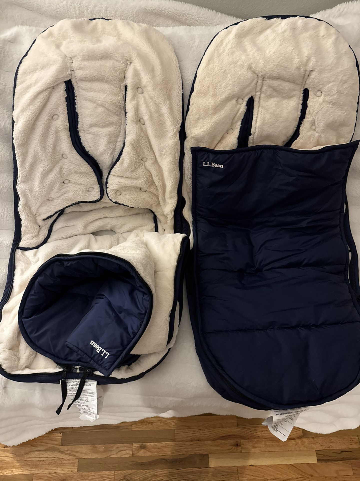 L.L. Bean stroller bunting x2. Soft and fluffy on the inside. Navy blue outside. $30 for both.