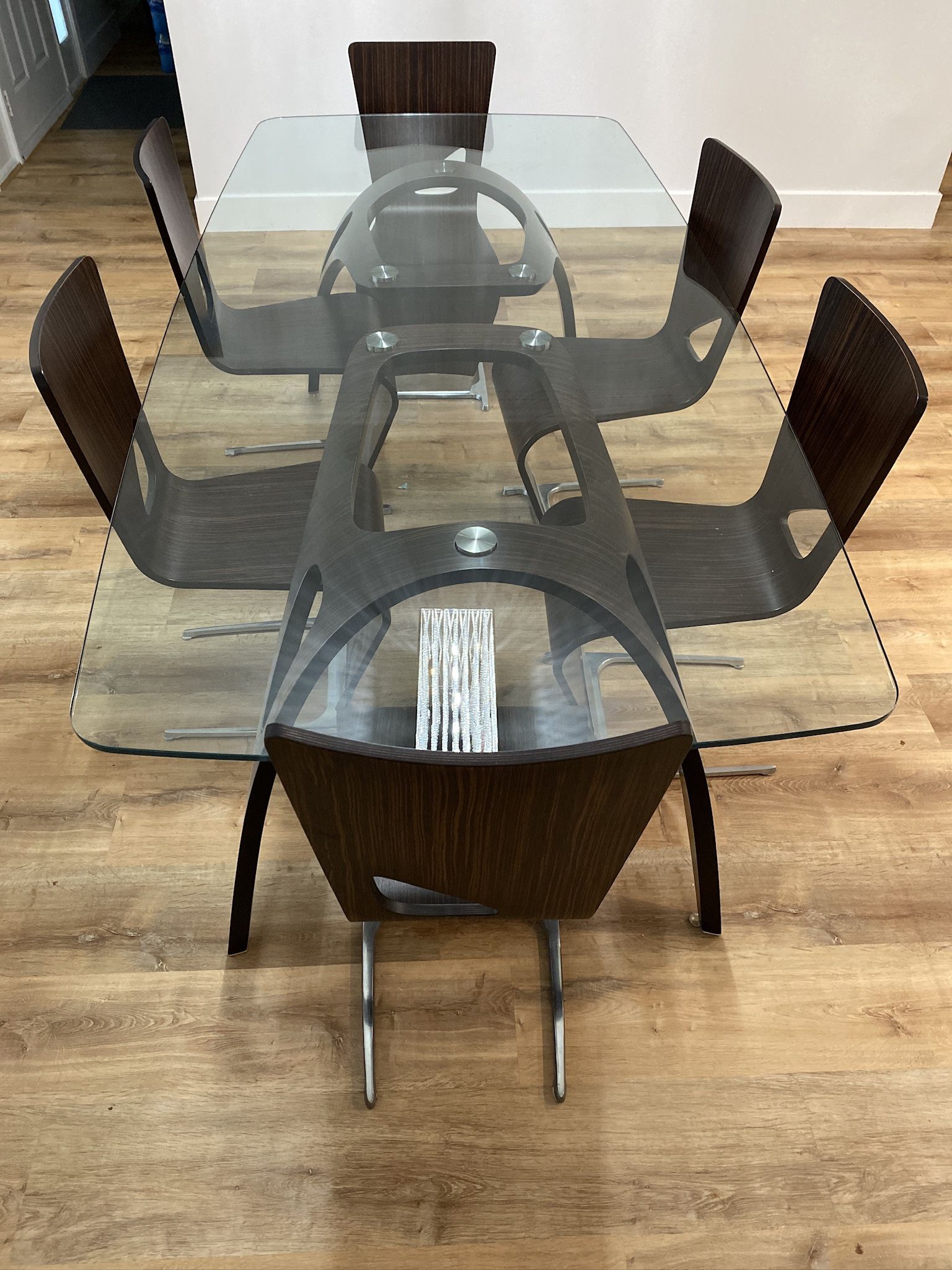 Iconic, Rare and Luxurious Modern Table and 6 chairs. With its unique shapes and style, the Dyna Table designed by world renowned Sacha Lakic will always be an iconic piece perfect for Roche Bobois fans and collectors. This rare and luxurious Roche Bobois Dyna dining table is a perfect addition to your home decor. Crafted with exceptional quality and design, it is sure to impress your guests. The set includes a beautiful dining table, making it an ideal choice for a family dinner or entertaining friends. The Roche Bobois Dyna dining table shows elegant design and exquisite craftsmanship. This dining table is a must-have for any homeowner who wants to add a touch of sophistication to their dining room. Table Measures approximately 90inches long by 43.5in wide. Features a tempered glass top and perforated composite panel legs with Alpi veneer and ebony finish. About the Designer Designer Sacha Lakic has a passion for cutting-edge technology that he has applied to ambitious designs for futuristic cars and motorcycles. Each of his designs showcases supple yet dynamic shapes – his signature. For Roche Bobois he designs furniture with fluid, sleek lines that match rigour and sensuality, logic and passion. This Modern table Sold as-is and where is. Buyer assumes responsibility and cost for obtaining professional and insured movers to remove dining set. Freight shipping can be arranged at buyer's expense. Perfect for anyone who likes modern tables from Design Within Reach, Pottery Barn, Crate and Barrel, 1stDibs and Room and Board.