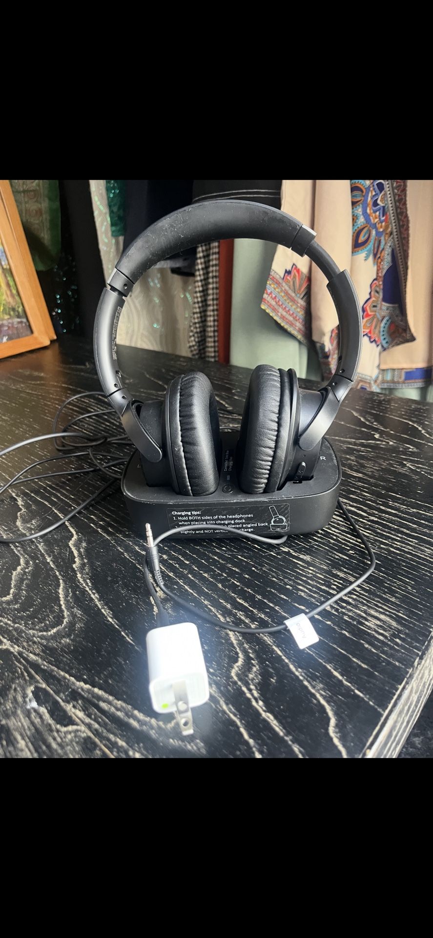 Wireless over-ear headphones with charging base included. Comfortable cushioned ear pads, great sound quality for music, calls, or TV listening. Includes power cord and audio cable. Fully functional.