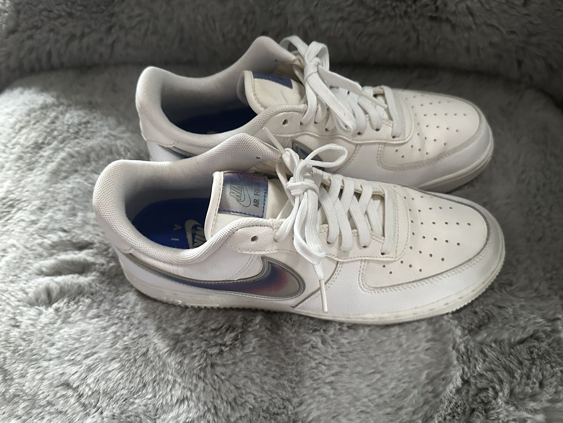 Nike Air Force 1 sneakers. White color with cool iridescent swoosh detail. Size 8 men’s No Box