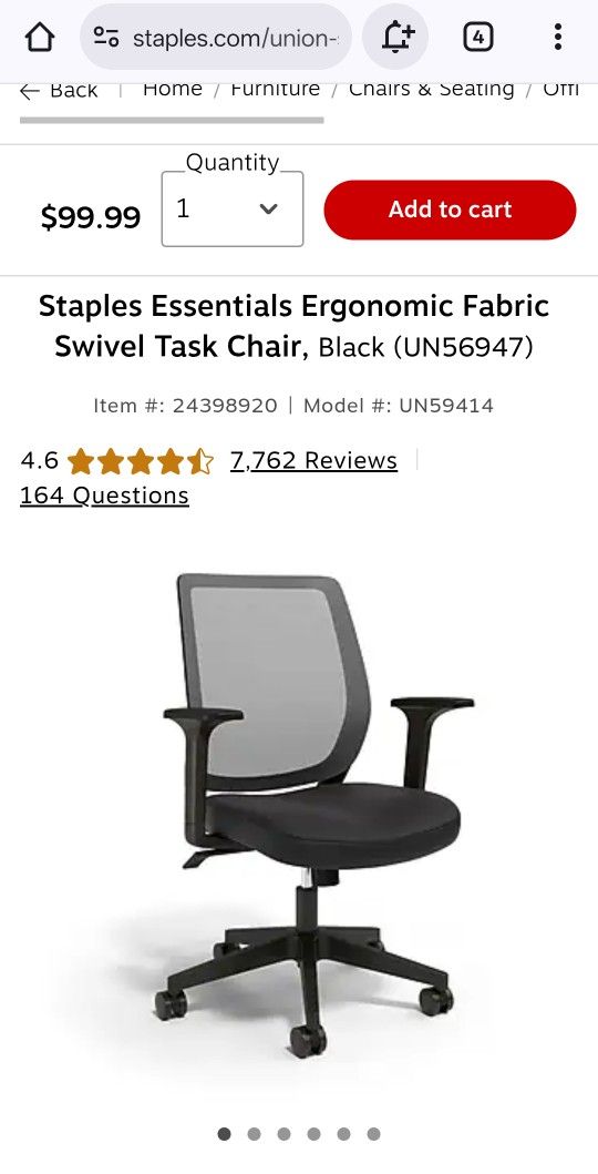 Staples Mesh And Fabric revolving Chair. Very good for working on computer. Since it's mesh it doesn't get hot. Condition- Good condition. Pet free. Bought originally from Staples store at $100. Selling due to relocation. Pick up - Can be dissembled however it's was tough to assemble it so must pick up as it is. Location is apartment complex in Schaumburg,IL. Can bring to your car. Thank you for viewing my post.