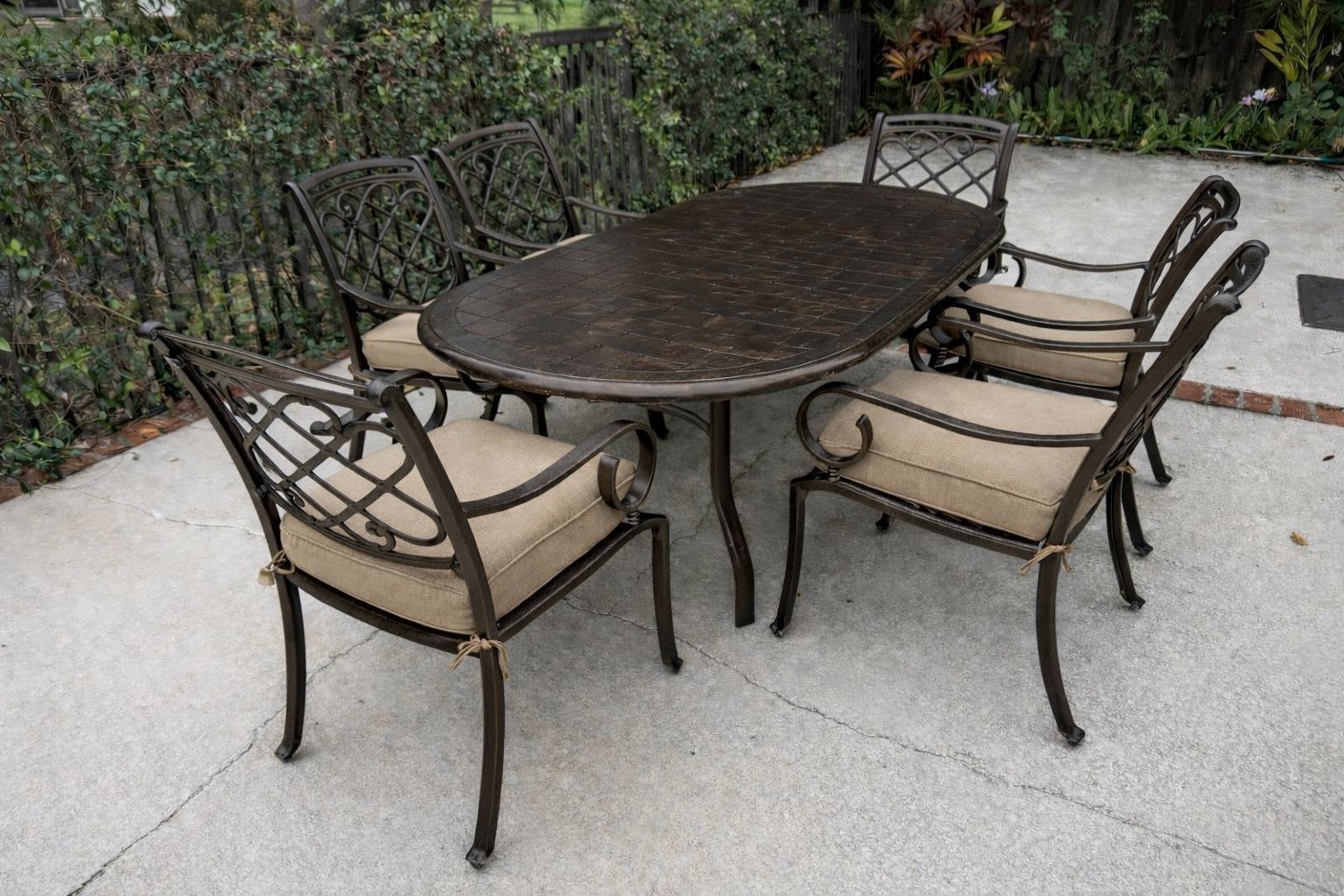 Beautiful 6-piece outdoor patio dining set made from durable cast aluminum with a classic oil-rubbed bronze finish. The elegant lattice design gives it a timeless look that works great on patios, pool decks, or screened porches. The oval dining table comfortably seats 6 people, making it perfect for outdoor dinners, entertaining guests, or relaxing outside. Cast aluminum furniture is rust-resistant, heavy, and built to last outdoors, unlike cheaper steel sets. Includes: • 1 oval dining table • 6 matching armchairs • 6 cushions Features: • Solid cast aluminum construction • Oil-rubbed bronze finish • Weather resistant • Elegant lattice design • Comfortable armchairs • Seats 6 comfortably Condition: Great condition overall. Sturdy, clean, and ready to use. Pickup: Delray Beach See my other amazing furniture on my listing U