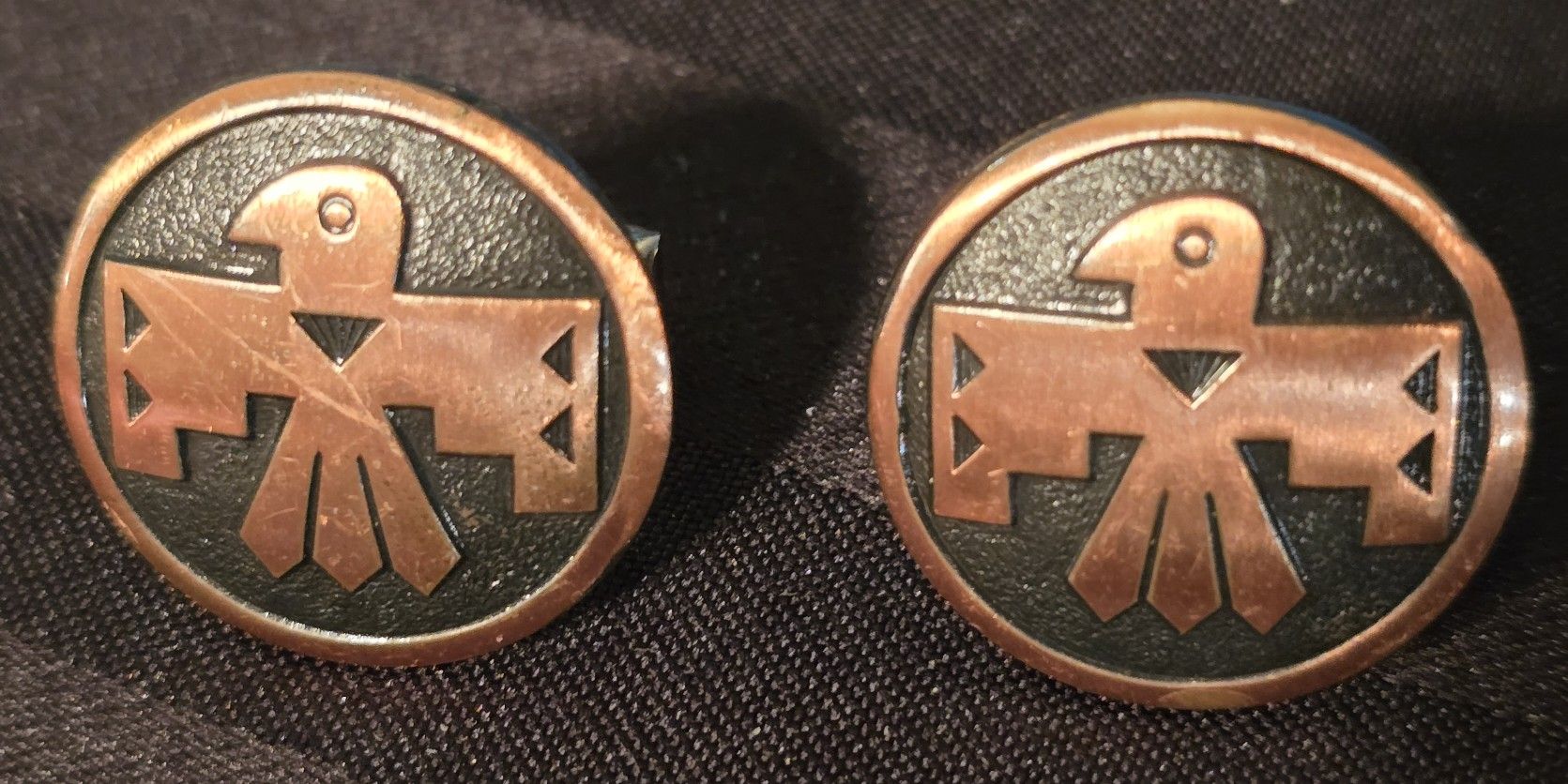 This vintage Southwestern copper cufflink set features a round Thunderbird design, perfect for adding a touch of indigenous flair to any outfit. Made from copper sourced in the United States, these cufflinks are a unique and original piece for fashion-conscious individuals looking to make a statement. With a patent number of (contact info removed) and a vintage brand, these cufflinks are sure to stand out in any collection. On the back of it when you twist it onto the shirt it is a little corroded as shown in the pictures. Don't know if it's real copper or not. Please look at the pictures very closely thank you. There is a small scratch on one of them you could hardly see it.