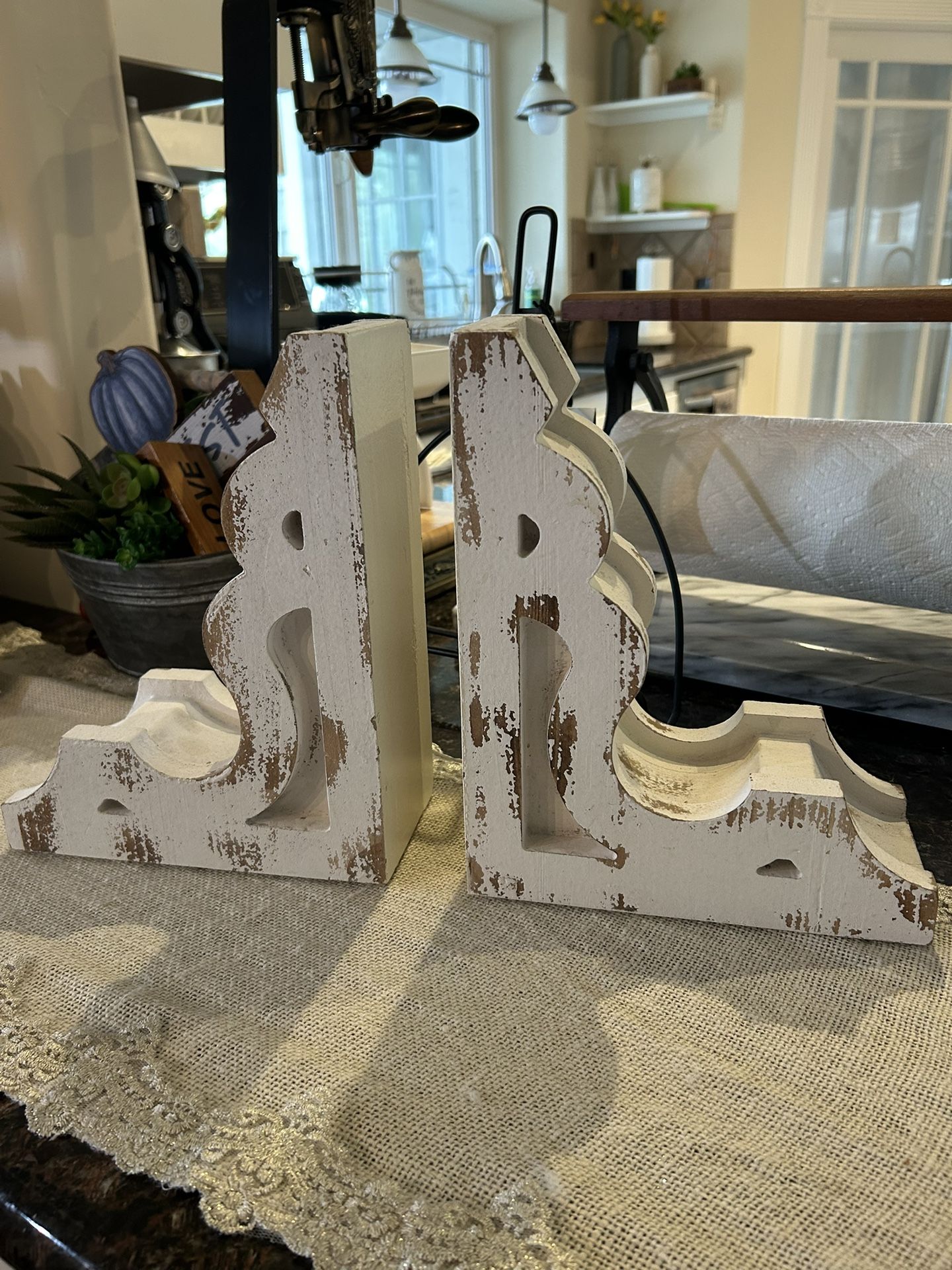 Decorative distressed white wood bookends / book holders with a farmhouse-style finish. Solid and sturdy, designed to hold books upright on shelves, counters, or tables. Distressing and wear are part of the intended rustic look. Condition: Good decorative condition with intentional distressing as shown. Perfect for: • Cookbooks • Decorative books • Farmhouse or cottage decor • Kitchen, living room, or office styling Quantity available: 2 sets (4 bookends total). PRICE IS FOR ONE SET. BOOKS IN PIC NOT INCLUDED