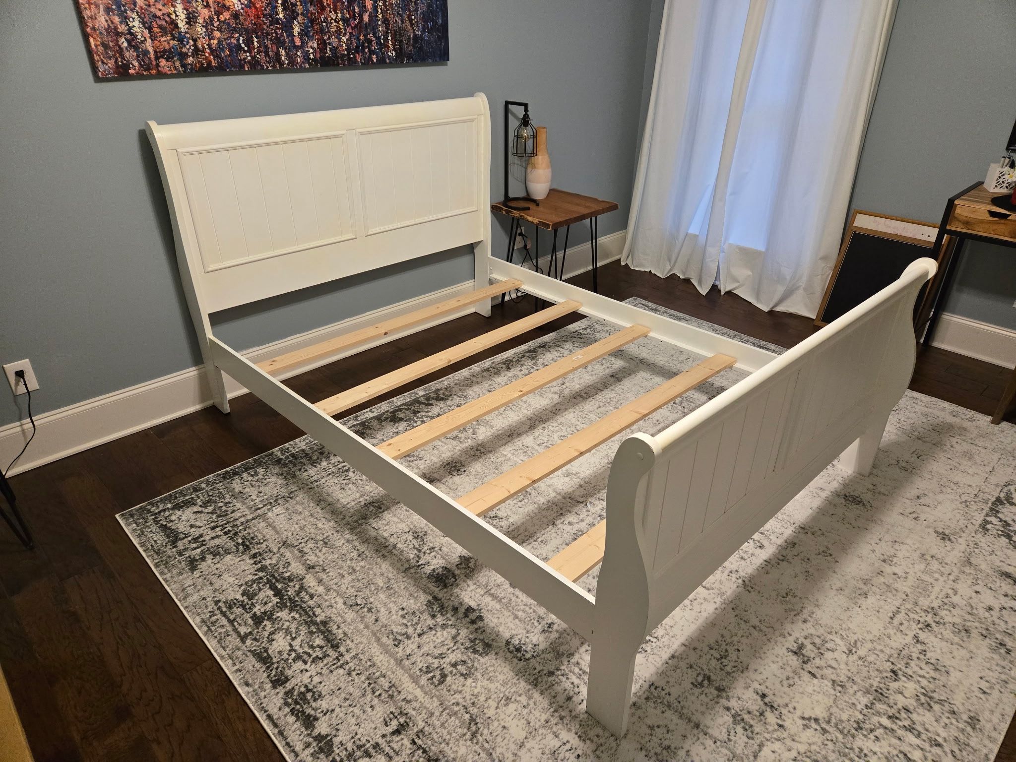 White, queen sized, sleigh bed. Slats and side ails included. NO MATTRESS OR BOX SPRING