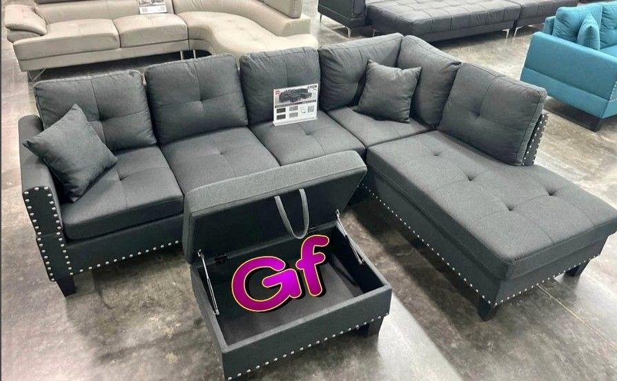 BRAND NEW 3PCS SECTIONAL SOFA SET WITH OTTOMAN AND ACCENT PILLOW INCLUDED ALL NEW IN BOX ASSEMBLE REQUIRED AVAILABLE IN GRAY OR CHARCOAL FABRIC