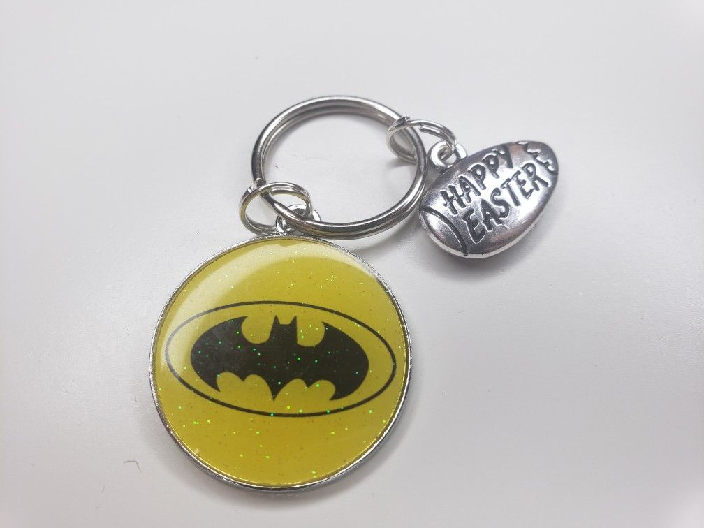 Batman DC yellow black Happy Easter charm silver keychain keyring super hero great for backpacks I can combine shipping with other items let me know b