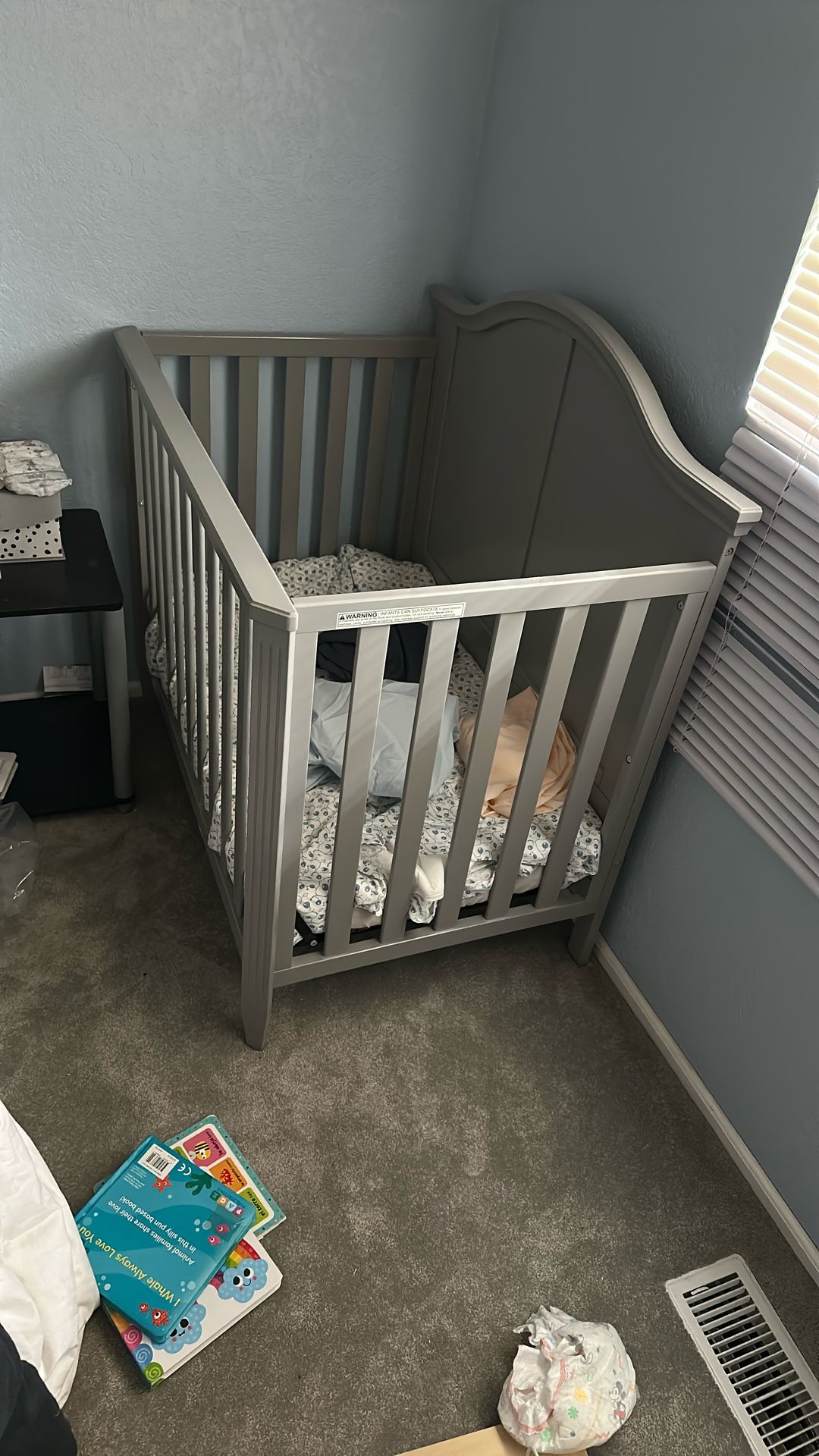 High quality wood and mini size Bailey baby crib for reduced spaces with mattress and 4 bed sheets/ cover. Baby never slept in crib, only sat and stood in it maximum 10 days. Converts to twin size bed.