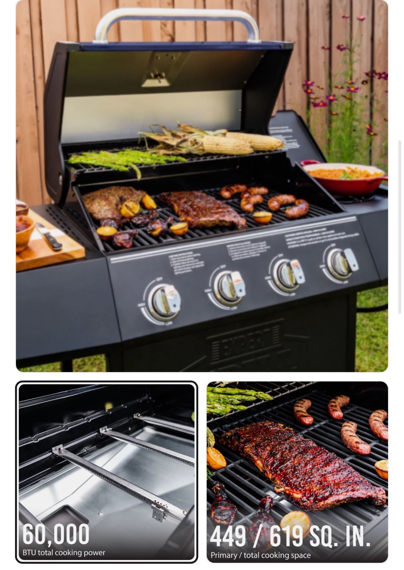 Only used once - just needs a good while down! Enjoy a day with friends and family when grilling out on this 4-Burner with Side Burner Gas Grill in Blue. This gas grill features a total cooking area of 619 square inches for all barbecuing needs. Use the stainless steel burners gas grill to prepare burgers, hot dogs, vegetables and other foods for birthday parties, tailgating, barbecues and much more. It can be moved from one place to another easily with the two wheels that roll smoothly across flat surfaces. Gather friends and family around the backyard to enjoy each other's company as they eat meals prepared with this gas grill. This cast iron gas grill is an attractive piece for the patio, porch or deck and offers push and turn ignition for added convenience. This 4-Burner with Side Burner Gas Grill in Blue is easy to maintain and can be stored in the garage when not in use. The 4-Burner with Side Burner Propane Gas Grill in Blue. Look to the expert, the Expert Grill 4-Burner Gas Grill. 4 Stainless steel burners with Cast iron cooking grates 454.14 sq. in. main cooking grates area offers plenty of grilling space. 619 sq. in. of total cooking space Push and turn ignition system for easy firing up of your grill. 60,000 total BTUs for ultimate grilling control. Porcelain enamel firebox. Temperature Gauge Type:Stainless Steel, Round. Lid: Porcelain Enamel in Black. Tank Attachment:Integrated on cart frame. When it’s time to clean up, 2 heavy duty wheels offer easy transport for storage Porcelain enamel lid offers superior durability, keeping you up and grilling for seasons to come. Specifications Grill Type Gas Grill Is Wheeled Y Number of Burners 5 Count 1 Price Per Unit UOM Each Has Tank Tray Y Model (contact info removed)MB Fuel Type Propane Total Cooking Area 619 sq in Has Side Shelf Y BTU 60000 Piece Count 1 PPU Quantity of Units 1 Each Is Portable Y Count Per Pack 1 Product Name Expert Grill 4 Burner with Side Burner Propane Gas Grill in Blue Is Assembly Required Y Is Weather-Resistant Y Manufacturer Part Number (contact info removed)MB Home Decor Style 1 Assembled Product Weight 68.34 lb Assembled Product Dimensions (L x W x H) 51.97 x 25.20 x 46.65 Inches