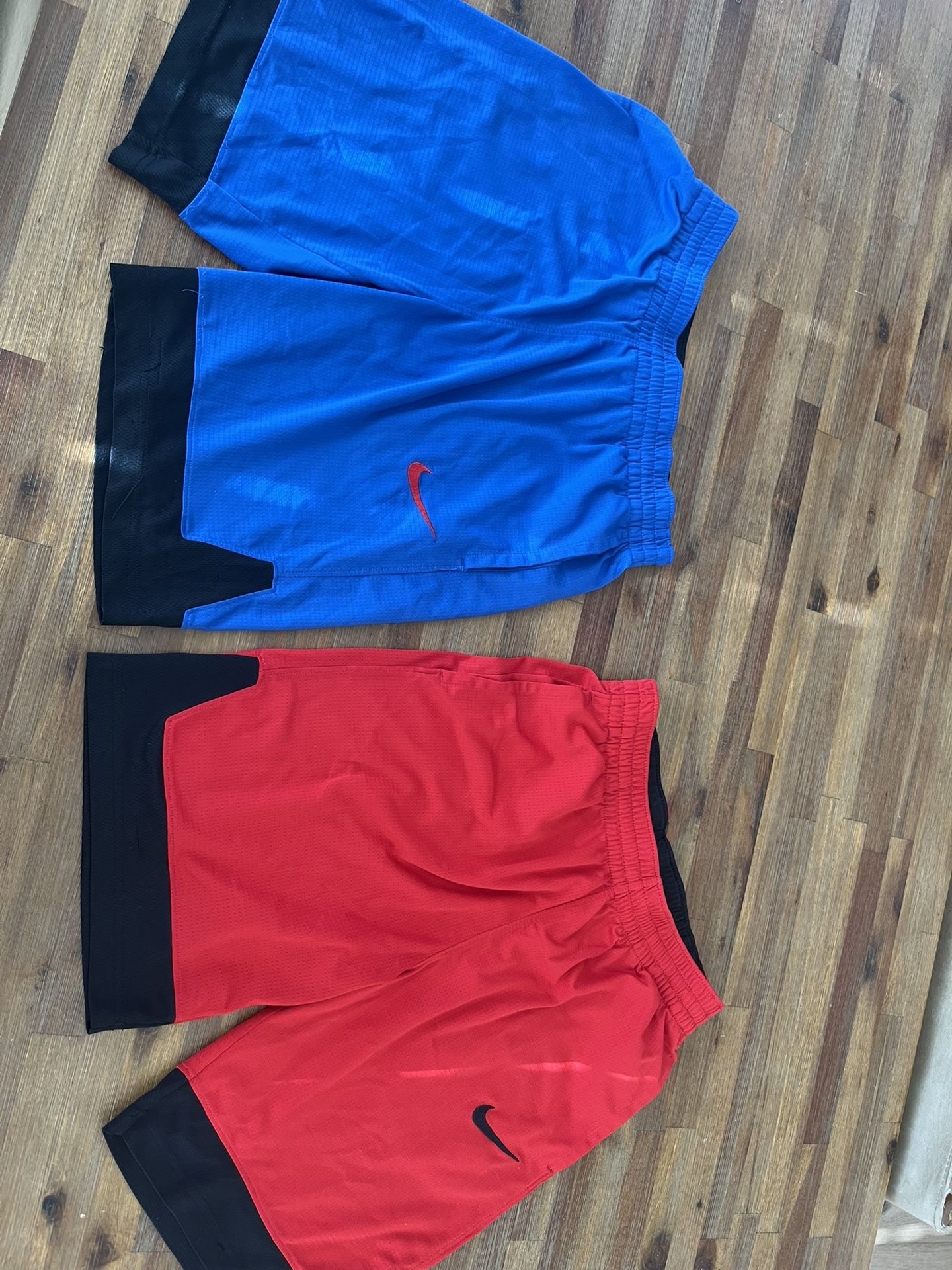 Two pairs of NIKE DRI- FIT Youth Boys Athletic Shorts LARGE. Standard fit. Blue/black & red/black. Both have pockets. Normal wear - overall, in very good condition! Pick up in Justin, 76247. CASH ONLY.