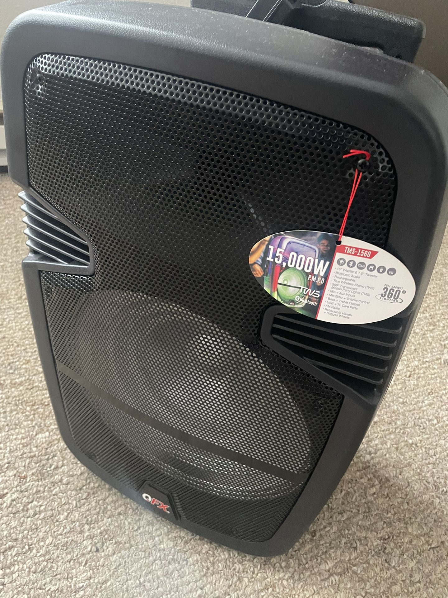 Selling a powerful 15” portable party speaker in great condition. Super loud with clear bass — perfect for parties, events, or just turning up at home. ✅ Bluetooth ✅ Rechargeable battery ✅ LED party lights (360° lighting) ✅ Mic + AUX inputs ✅ FM radio ✅ USB / TF card ports ✅ Rolling wheels + handle (easy to move) Everything works perfectly. No issues. Great sound, great volume.