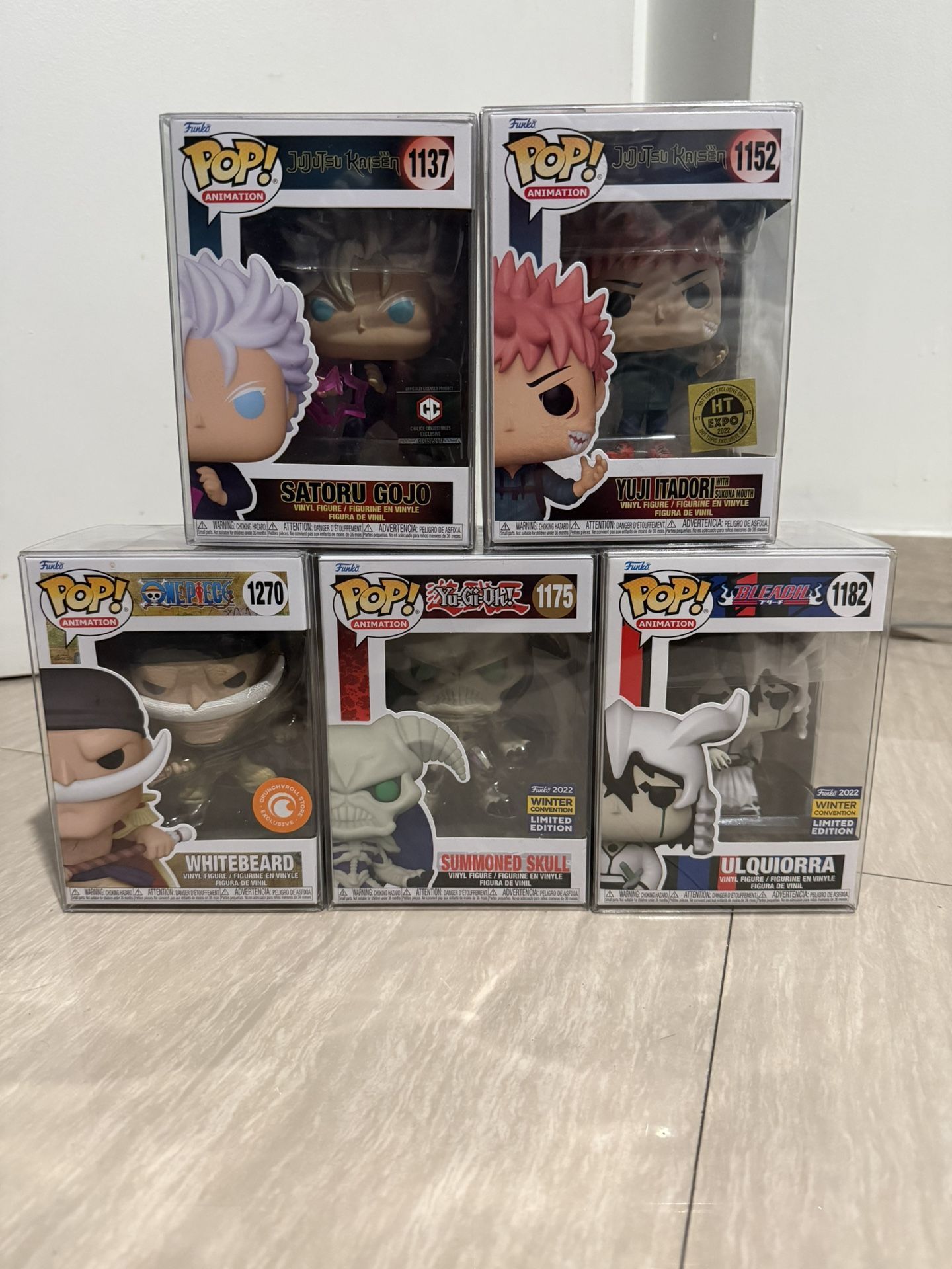 Anime / Manga Funko POP! For Sale, doing bundle for all or separate. Mint POPs comes with Protector. Price / OBO. DM if interested, can work prices. *Bundle/Buy All: $35. *Buy Single / 1 unit Yuji Itadori (with Sukuna mouth) #1270. $20 Whitebeard #1270. $10 Summoned Skull #1175. $15. Satoru Gojo #1137. (SOLD) Ulquiorra #1182. (SOLD)