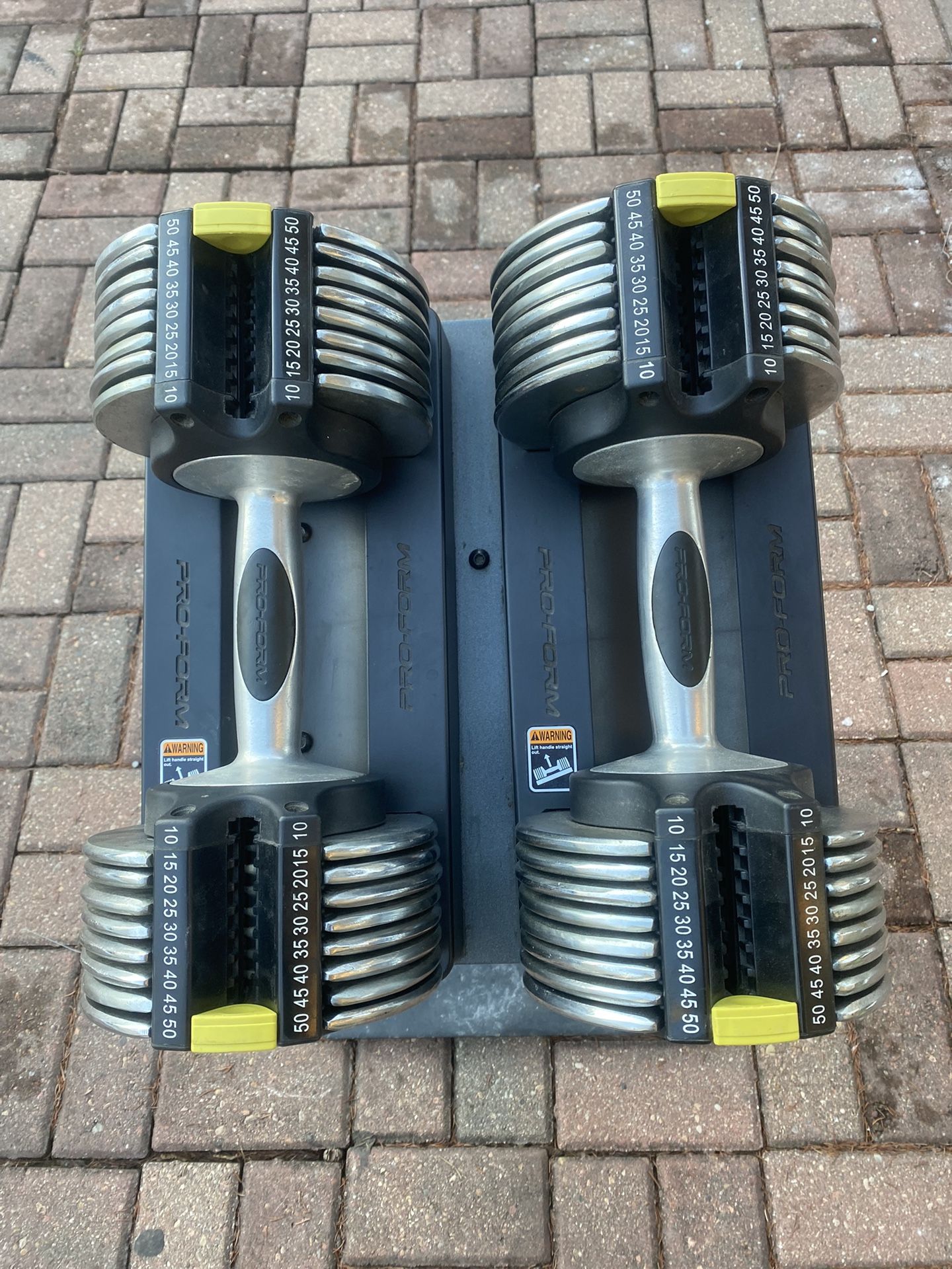 Complete set of ProForm Fusion SpaceSaver adjustable dumbbells with the original stand. Each dumbbell adjusts from 10 to 50 lbs, giving you a total of 100 lbs in a compact setup. Easy dial system lets you change weight in seconds. Features: ✅ Smooth weight selection ✅ Space-saving design ✅ Stand included (no bending to pick up weights) ✅ Great condition, fully functional ✅ Perfect for home gyms, strength training, or saving space Retail was much higher — these are solid and hard to find with the stand. Local pickup only. Cash preferred. Message me if interested.