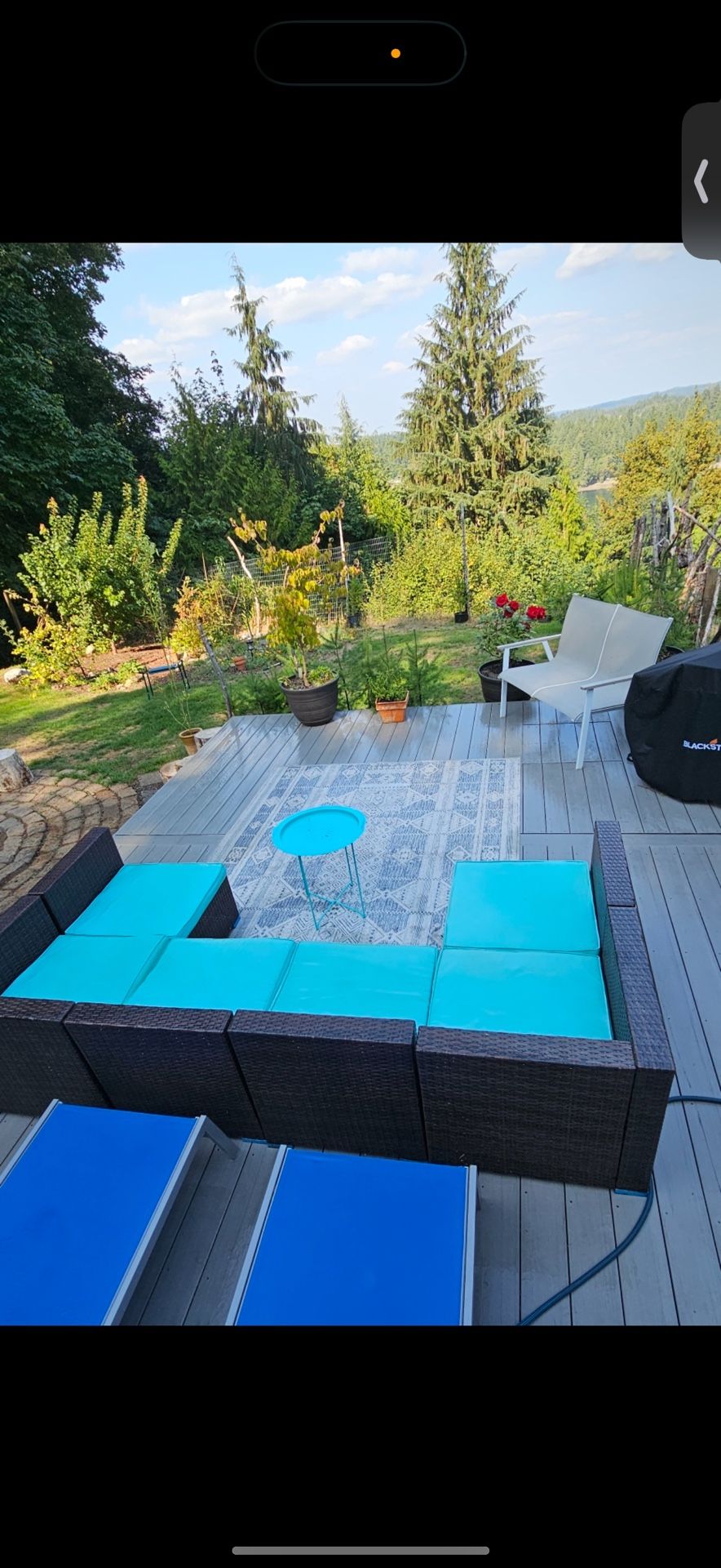 6 seater outdoor sectional couch with teal/light blue couch cushions