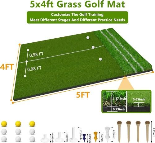 Golf Mat with Dual Turf, 5x4ft Heavy-Duty Golf Hitting Mats Practice Outdoor/Indoor, Elite Dense Artificial Thickened Green Turf Matt Training Aid for Backyard/Garage/Driving Range/Simulators Brand new On Sale !! Very Good quality!! ***PRICE IS FIRM*** ***First Come First Serve*** *Check Size Details* Click on my profile listing to check more items. Our warehouse is located near Katy Legacy Stadium If you would like to come pick up DM me or call for address Ultra-Thick 36MM–60MM Cushioning & Shock Absorption: Designed with a heavy-duty 36mm to 60mm thickness structure (16mm dense turf, 20mm high-elasticity EVA pad and 40mm rough turf), this golf hitting mat absorbs over 90% of ground impact to protect clubs and joints. It provides maximum stability on any surface, ideal for daily practice on concrete, grass, or in simulators Built for Commercial-Grade Durability: Engineered with an anti-tearing layer and reinforced edges, this golf mat withstands the impact of repeated golf shots without showing signs of wear and tear. The dense artificial grass resists flattening, fraying, and weather damage — ideal for year-round golf practice High-Density Artificial Turf: This golf simulator mat closely mimics the real hitting feel and performance of natural grass for refining your swing and chipping skills. Crafted with UV-resistant artificial grass, the PENSUN golf mat ensures all-weather performance, perfect for indoor and outdoor practice (the backyard, garage, or driving range) 5x4ft Extra Large Size Golf Mat: This 5x4ft golf mat is spacious enough to offer ample room for full stance adjustments and maximum forgiveness for mis-hits. It features 6 tee positions, suitable for left/right-handed golfers and ideal for driving, chipping, and full swings. Perfect for all ages — from beginners to advanced players Ideal Gifts for Golfers: Complete with a golf mat, 9 golf balls, and 10 golf tees, this golf hitting mat set is a standout gift for men, dads, husbands, and golfers on Father's Day, birthdays, or holidays. It’s an all-in-one solution for beginners to pros — letting you save on range fees and train like a pro!
