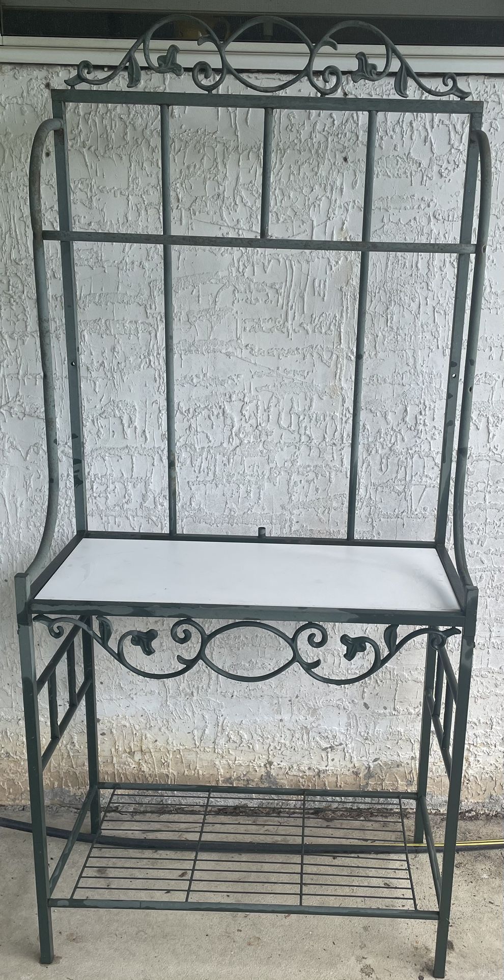 70x31.5x16 Metal Bakers Rack with Corian Shelf. Could use a coat of paint but very sturdy. Use as plant stand or repurpose into many other things. Pick up only.