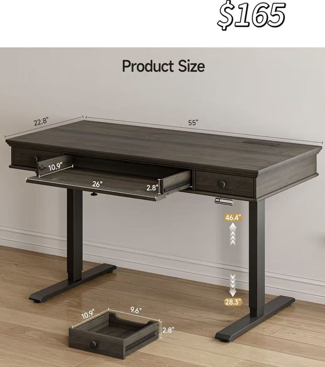 ONBRILL Standing Desk with Drawers, 55 x 23 Inch Electric Height Adjustable Desk with Storage & Outlets, for Computer Workstation, Home Office, Retro Curved Table Corner Design, Dark Walnut ❤️Assembled from the box and displayed in our showroom by co-worker 🙏pay $165.00 + sale tax by cash or card in person over our Brick-and-Motar store ONLY (final sale). ✌️Not Accept price negotiation through thIs OfferUp App ; The price is as marked. 🛑NOT Accept any online payment method at all, since our store policy requires clients to check items in person. ✌️Pick up at showroom : zip code 80231(😀) or 80223(✌️) or 80241 (🥨)depending on item ✌️Hour : from 10 am to 7 pm(Monday CLOSE) ✌️Pick up at showroom, No shipping, LIMITED delivery option ✌️ ‘’LIMITED Delivery option ‘’ may be available with ‘’EXTRA charge’’ . Please consult ‘’BRICK-and-MORTAR STORE IN PERSON’’ for delivery option & ‘’ EXTRA charge incurred from delivery “.( Can’t provide delivery details through OfferUp App due to complexity.) ✌️please stop by ASAP after all info(including address) provided OR ✌️double confirming “available or not” again if the address info is already provided for days.. 🙏can NOT relocate inquired item to other showrooms but you can wait to see if it is available in other showrooms (current item location zip code can be distinguished by 🥨😀✌️) ✌️ ALL furniture are new and not used at all. However, due to few careless or overweight handling during shipping, transport or assembly, few of them will have mild scratch or dents. So does some inventories in the box. We try our best to photo those in pictures after assembling them. The price is adjusted based on those issue that we notice. ✌️ Item sold as the picture (it is assembled ) or it will be mark as in the boxes 🥰Reminder: Please pay attention to the address I send you. NOT all showrooms carry the item you inquiring. There is higher chance the item may be ONLY available currently in this Specific ADDRESS I send you. If you inquire multiple items, they may be located in multiple different showrooms…please pay attention to address. 🙏 You are welcome to ‘’GENTALLY CHECK ’’ items/ Furniture in PUBLIC showroom before deciding to purchase it or not. 🙏NO RETURN, NO REFUND, NO EXCHANGE