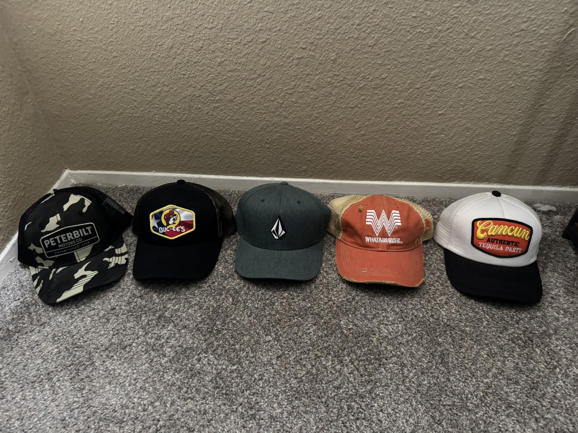 I don’t wear hats often so these are in very good or new condition. Cancun - $15 BUC-EE’S - $20 Peterbuilt, Whataburger, and Volcom - $30