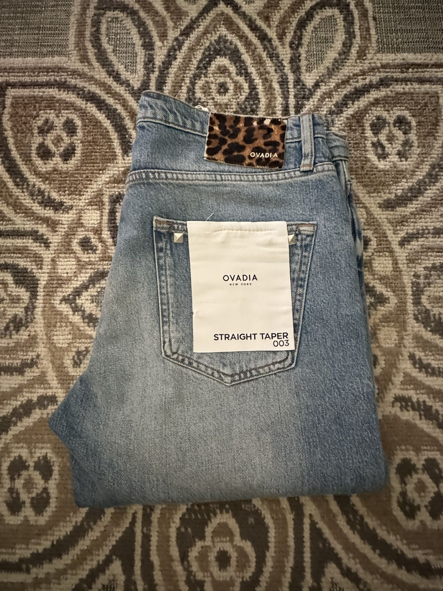 Ovadia New York Straight Taper 003 jeans in a light blue wash. Authentic New Size 33 , This Limited Edition Denim, Signature leopard print pony hair patch on the back waistband. Studded accents on the back pockets. Four-button fly closure. Purposely "dirtied" or distressed light wash aesthetic. Fit: Designed as a "skater style" with extra room to move, featuring a straight leg that tapers slightly toward the ankle. Retails Price $270 Plus Taxes