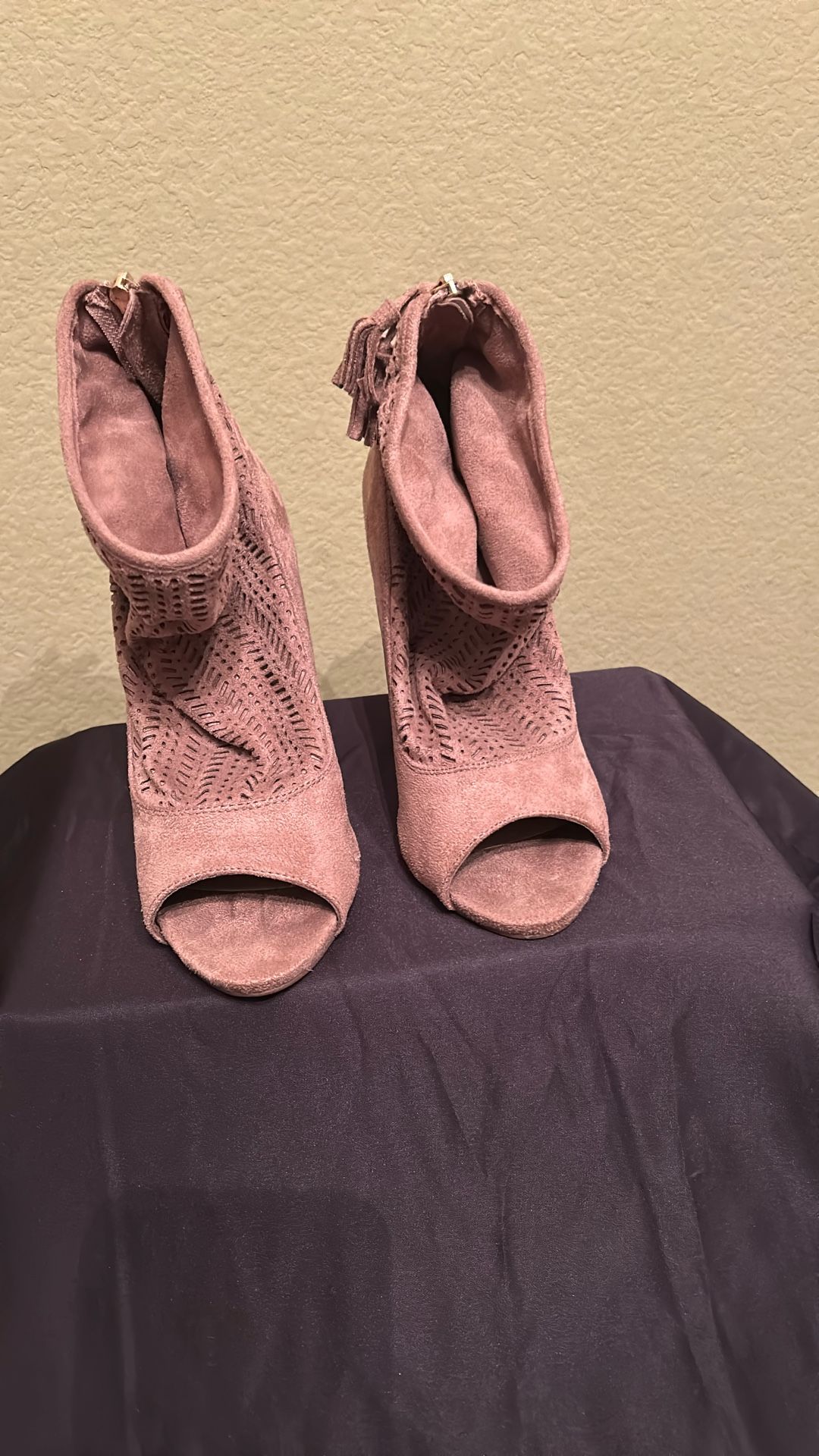 8.5 taupe color, 4.5 inch heel zipper in the back slightly worn, peep toe booties Slouch design