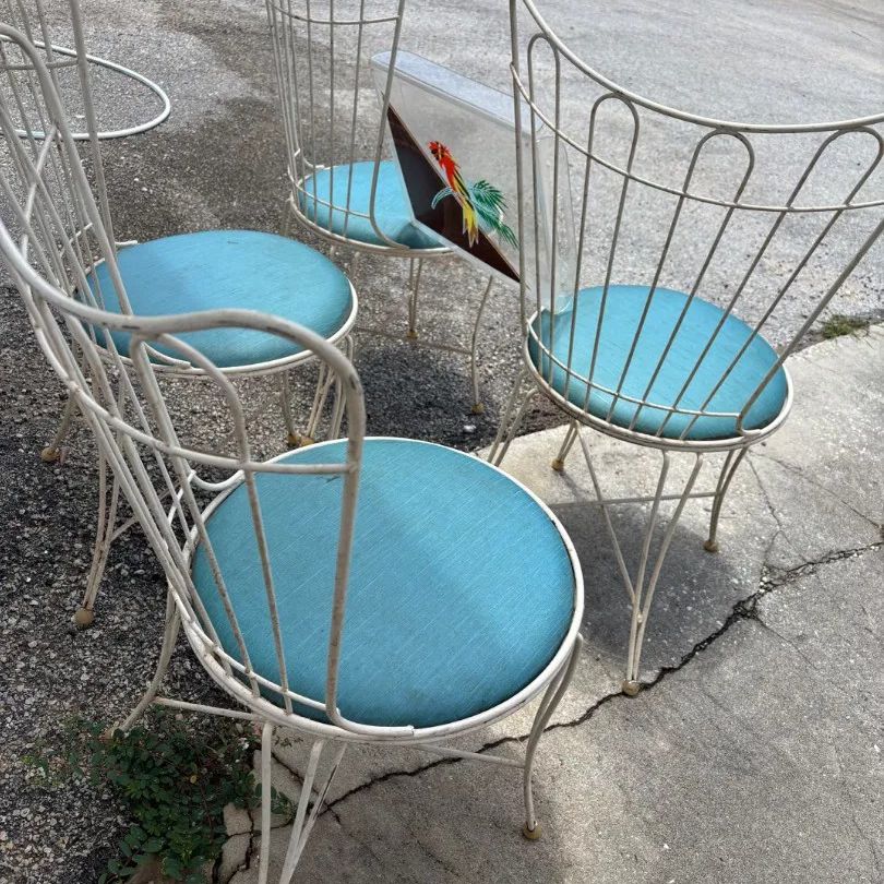 Set of four vintage metal chairs, painted white with vinyl turquoise round cushions. In sturdy condition with wear to some cushion tops. Chipping of some white paint and rust in some areas. Easy restoration project!