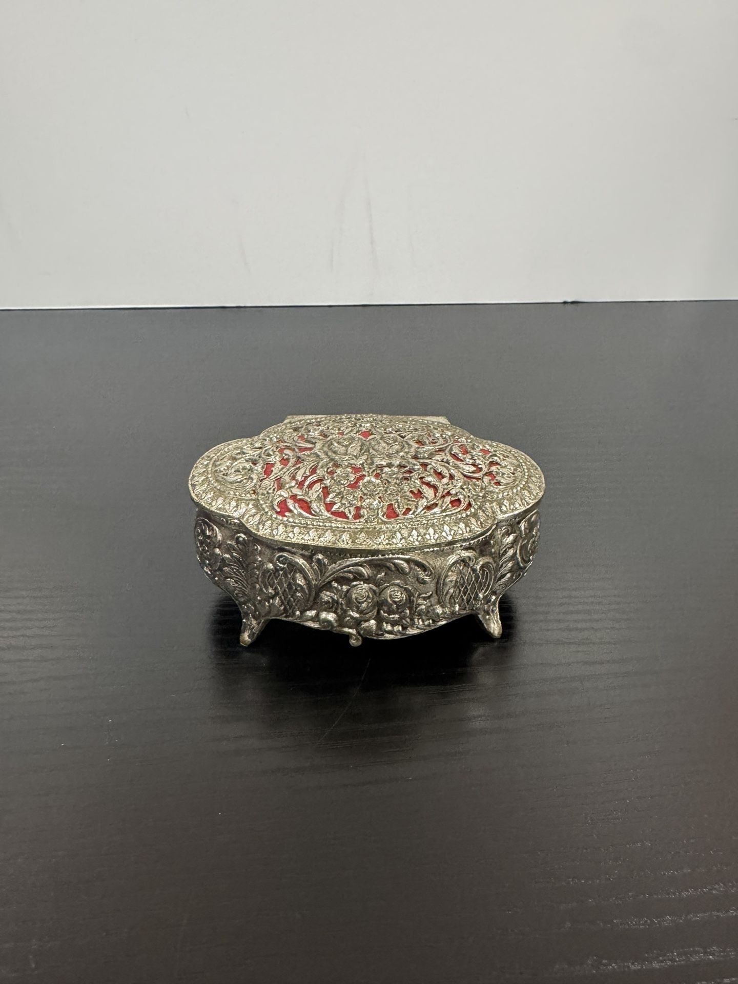 Decorative Ornate Round Metal Collectible Trinket Box with Red Lined Interior