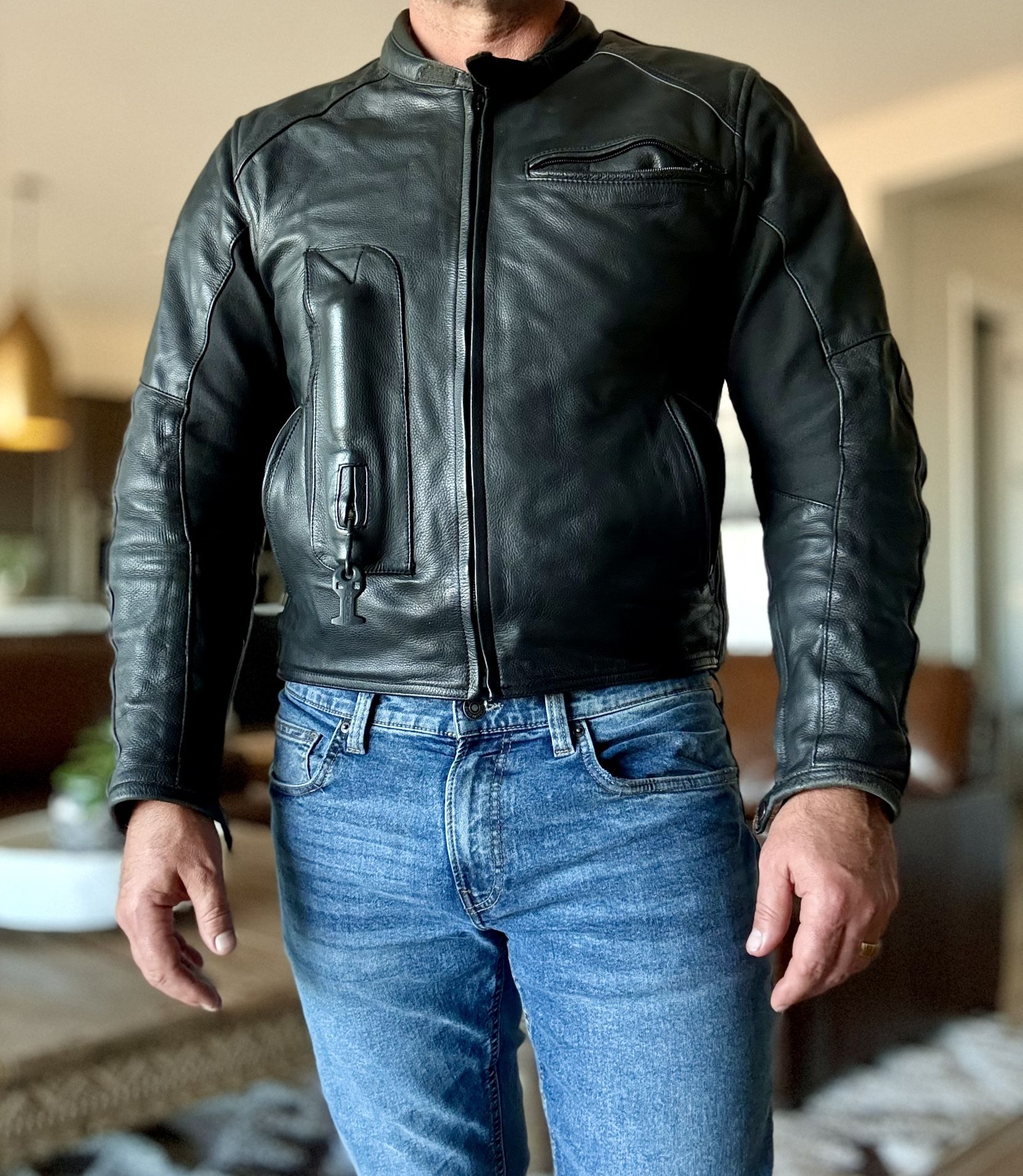 Leather Airbag Motorcycle Jacket. Uses the tether system to deploy, so no software updates or battery life to worry about. Just clip in and ride. It always made me feel %100 more protected. This jacket is in great shape. Size Large