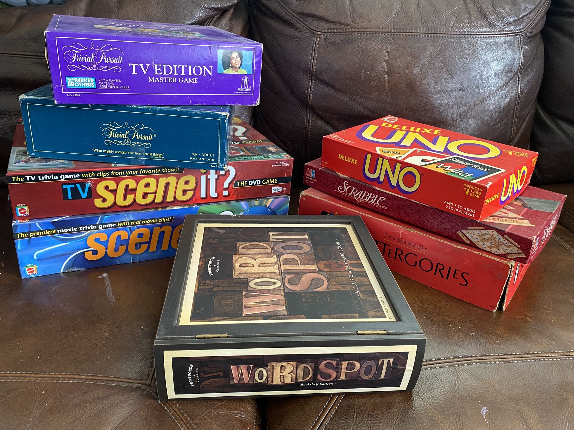 I’m moving and have to part with some of my favorite things. Hope these find a good home with a fellow lover of words games and trivia. Lot includes: Trivial Pursuit Master Edition, Trivial Pursuit TV Edition, Scrabble, Uno Deluxe, Word Spot, Scattergories,and two Scene It DVD Trivia games. Word Spot is new, unused. Trivial Pursuit Master Edition is like new. Scattergories is the only one that got a ton of use - and all pieces are still included. CASH OR VENMO ONLY