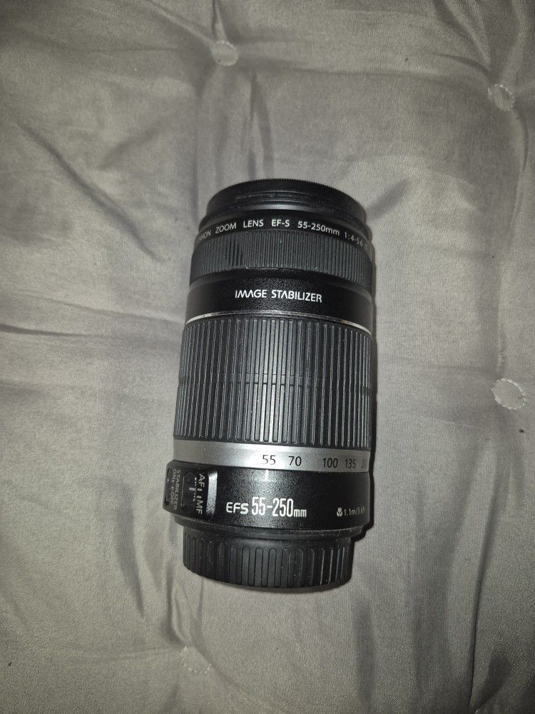 The lens in the image is a Canon EF-S 55-250mm lens. This lens is compatible with Canon EOS DSLR cameras that have an EF-S mount. Some of the compatible models include: EOS 7D and 7D Mark II EOS 20D, 20Da, 30D, 40D, 50D, 60D EOS 1100D, 1200D, 1300D, 1500D EOS Rebel series (e.g., T3, T5, T6, T7)