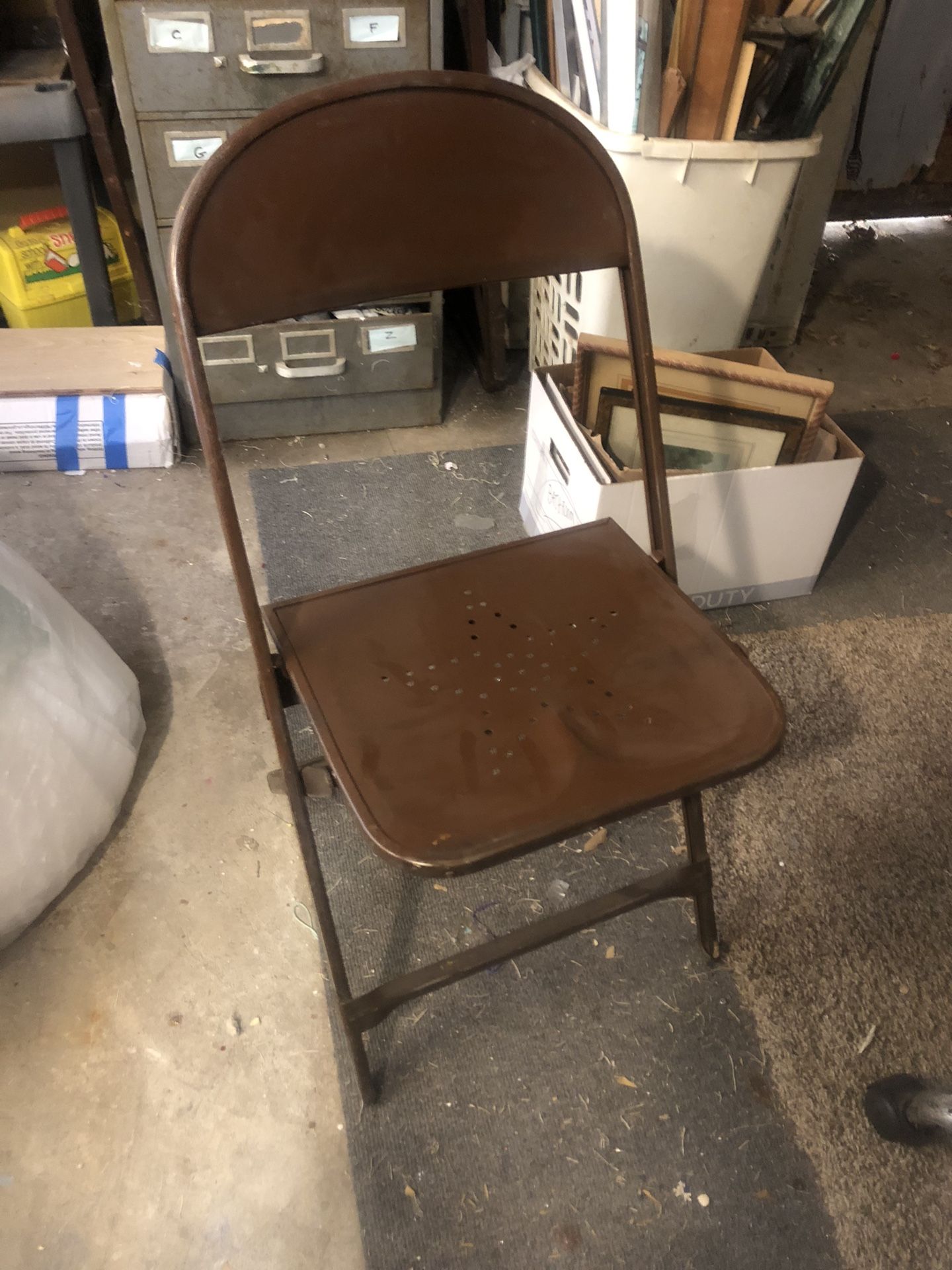 Vintage metal folding chair with decorative holes punched in the seat in the shape of a star. Brown. I have about 25 of these. In good overall condition. Some may have a little paint in them. Price is for each chair. $20 each.