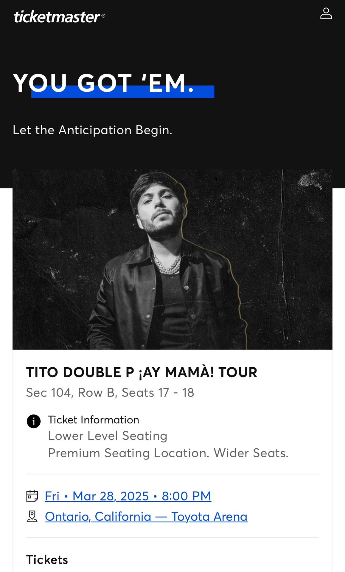 This is for the Ontario date on March 28th Retail for the pair is $1050 I can do $650 for the pair at best Section 104 Seats 17-18 Row B We can meet up for the exchange or whatever is more comfortable thanks If the post is up they are still available