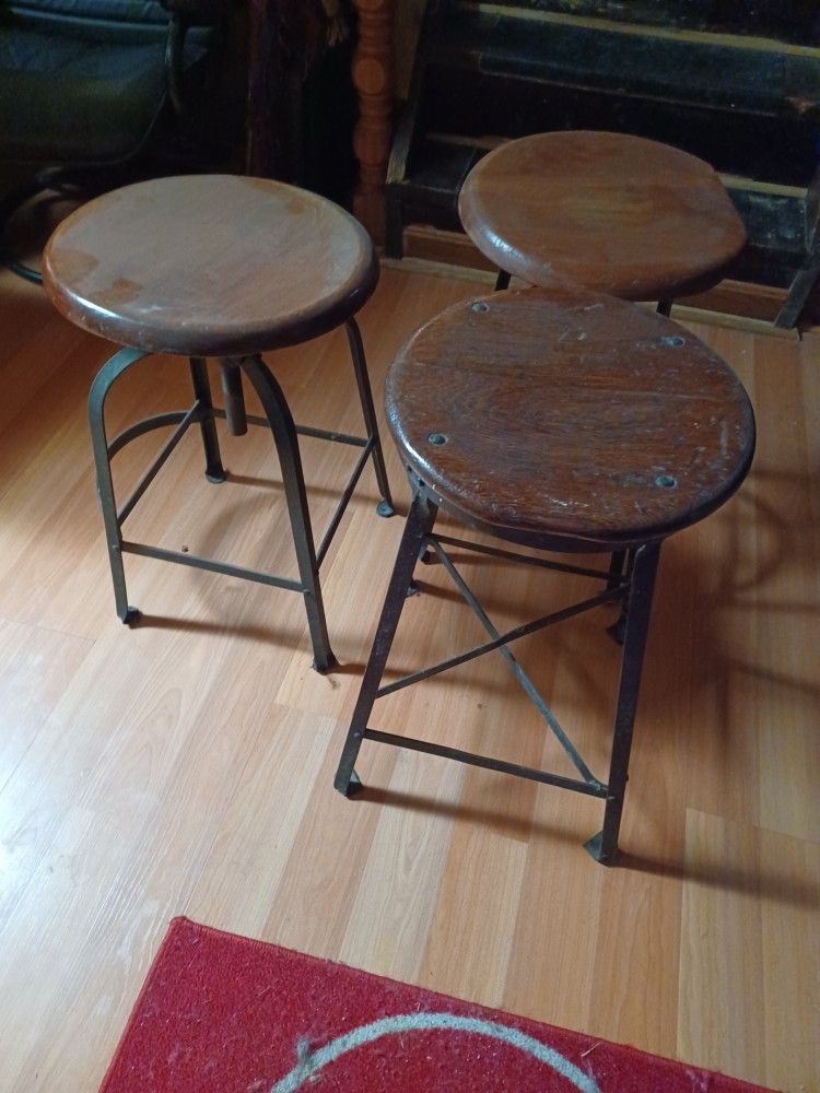 Trio of 1920's heavy duty industrial cast iron former USPS stools with oak seats in very good condition for being over a century old. 1 seat is fixed & 2 are height adjustable. Priced at $75.00 for trio or open to reasonable offer. Open to trades.