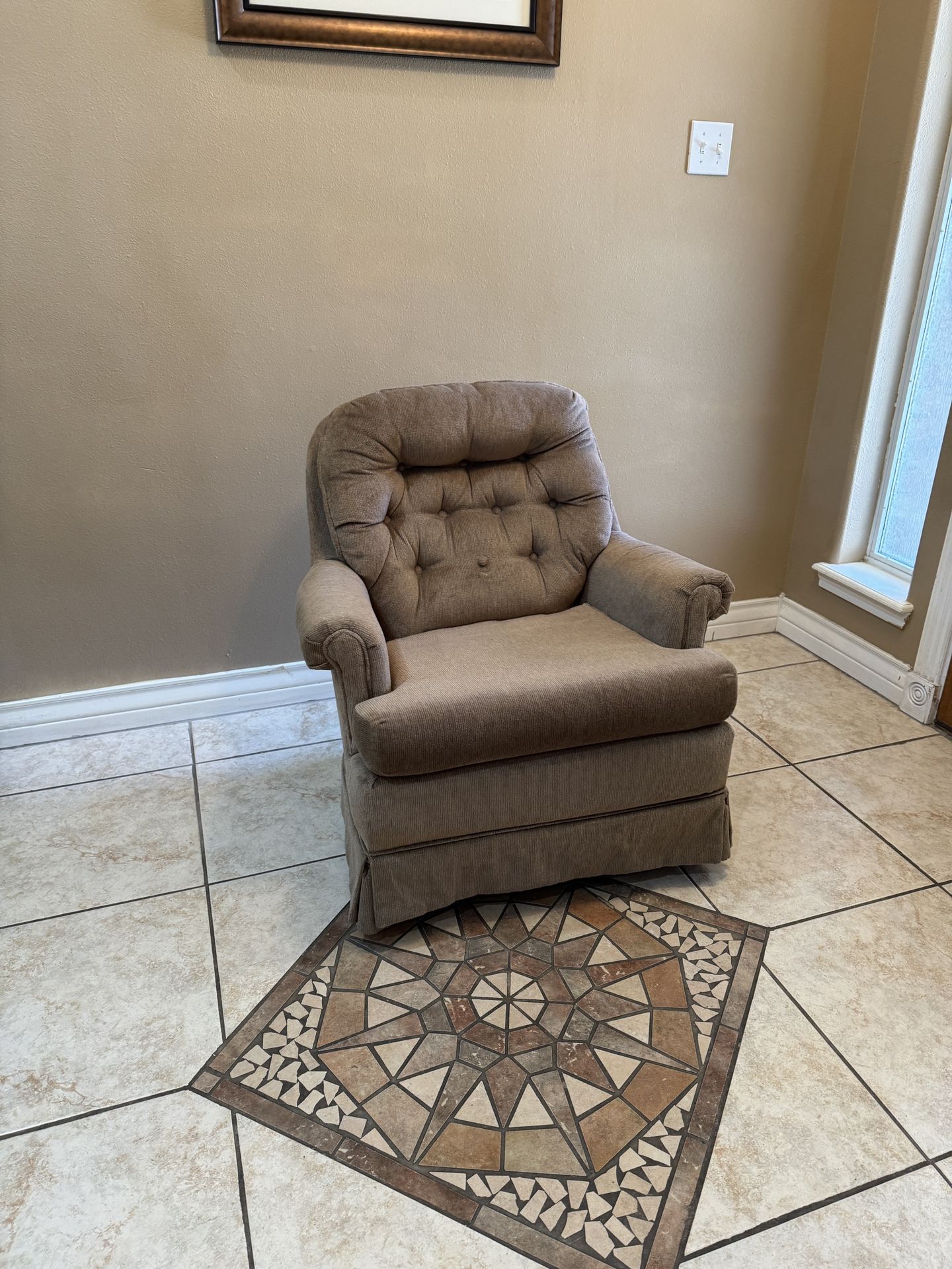 Traditional, retro, comfortable easy chair. Small so it’s perfect for small persons or children. Great cushioning and very comfy. Looks good in any room and everyone loves the retro vibe.