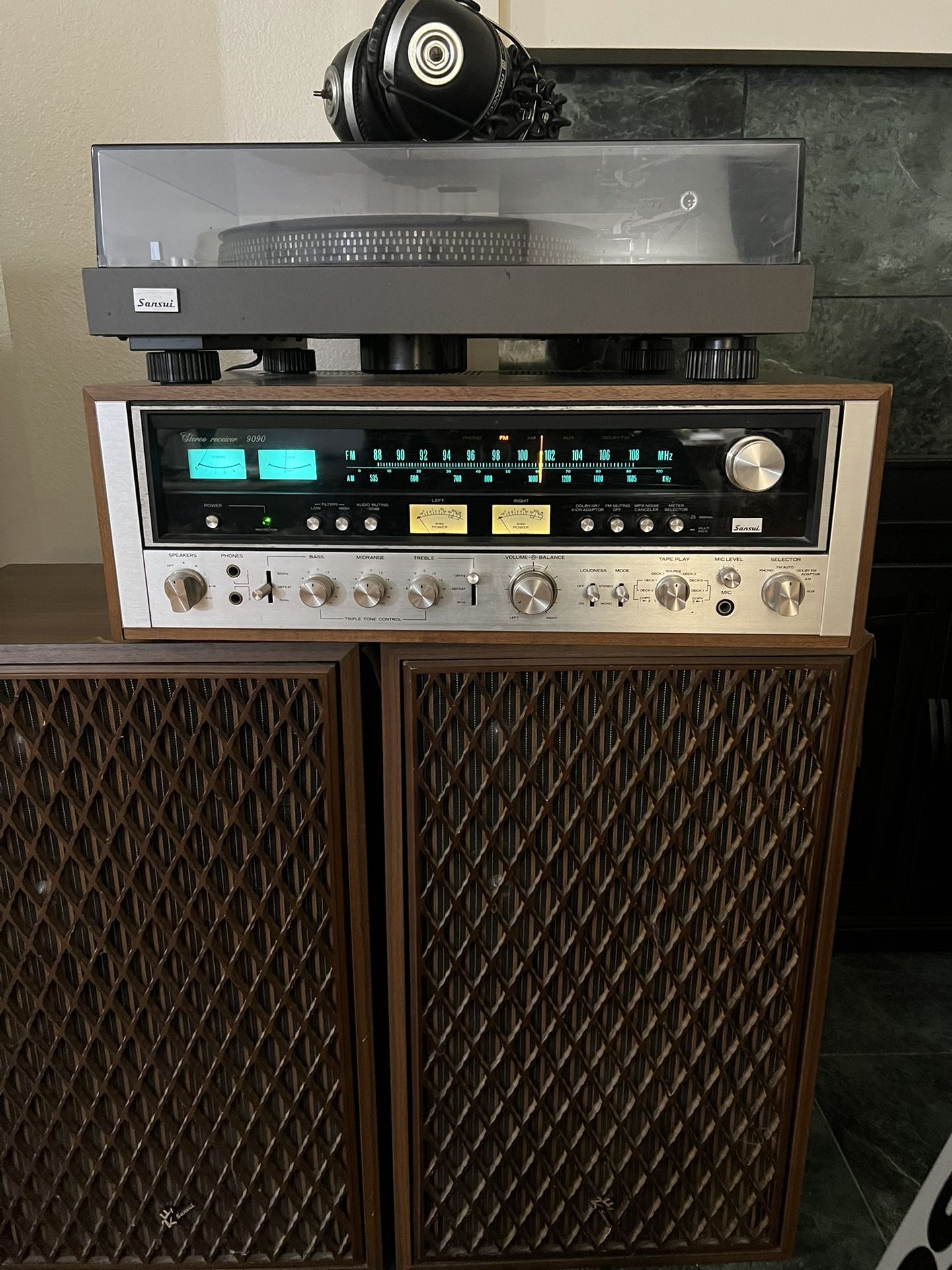 One owner bought new in 1977 barely used pretty much untouched for over 45years comes with Sansui record player/turntable and 2 Sansui speakers. The Sansui 9090 is a high output version of the 8080 stereo receiver with 110 watts continuous, per channel (minimum RMS) at 1000Hz both channels driven into 8 ohms, with no more than 0.2 % distortion. It has a highly selective FM front-end, through very sophisticated electronic design. Features include four meters: power (each channel); signal strength; tuning, power protection circuitry and LED indicator, triple tone control with turnover selectors, two tape deck terminal facilities, Dolby FM/4-channel adaptor facility, wide dynamic range from precise phono equalisation system, full range of controls, connections for three sets of speaker systems and FM Multipath detection system. Specifications Tuning range: FM, MW Power output: 110 watts per channel into 8Ω (stereo) Frequency response: 10Hz to 30kHz Total harmonic distortion: 0.2% Damping factor: 10 Input sensitivity: 2.5mV (MM), 100mV (DIN), 100mV (line) Signal to noise ratio: 70dB (MM), 80dB (line) Channel separation: 50dB (MM), 50dB (line) Output: 100mV (line), 30mV (DIN), 0.75V (Pre out) Dimensions: 540 x 182 x 397mm Weight: 23.3kg