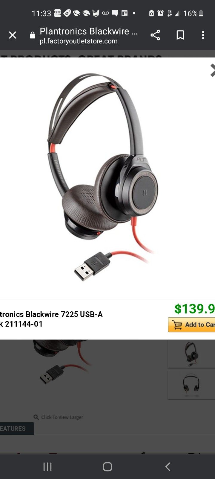 Basically new Comes with case Asking $80 Pick up in west Seattle Blackwire 7225 - Black USB-A The Plantronics Blackwire 7225 USB Headset offers a boomless corded headset design, hi-fi stereo sound and all-day comfort to provide you an ultimate listening experience. With Active Noise Canceling (ANC) technology and SoundGuard DIGITAL to protect against sound levels above 118 dBA, this headset provides with the best-of-the features. With added features like anti-startle (during calls) which detects and eliminates any large sudden increase in signal level; Time-Weighted Average that prevents average daily noise exposure from exceeding 85 dBA (enabled by Plantronics Hub), the Blackwire 7225 Headset offers great features bundled in one product Blackwire 7225 USB Headset Features: Stereo Corded HeadsetUSB-A ConnectionDedicated PC/Mac ConnectivityDynamic EQ for Telephony and Music32 mm Speaker SizeSoundGuard® DIGITAL for high sound level protectionFour Omnidirectional MicrophonesActive Noise Canceling Specifications: Codecs 24-bit audio:Up to 96 kHz Sample RateOpen Microphone:Yes Receive Frequency Response:20 Hz to 20 KHz Speaker Sensitivity:127 dB ±1.5 dB Speaker Impedance:32 ohms Anti-Startle Function:Yes Time-Weighted Average Function:Yes Microphone Frequency Response:100 Hz to 10 KHz Microphone Sensitivity:-26 dBFS +/- 3dB Call Controls:Call Answer/End,Mute,Volume Media Controls:Mute,Play,Pause,Track Forward,Back Supported Applications:Plantronics Hub for Windows/Mac