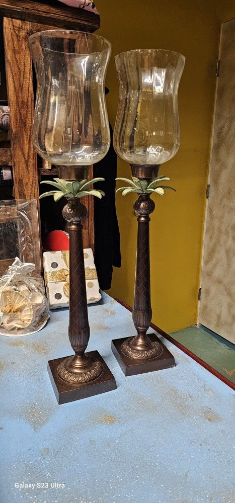 Vintage brass palm tree hurricane candle holder Set Of 2 Huge 26.5 Inch India