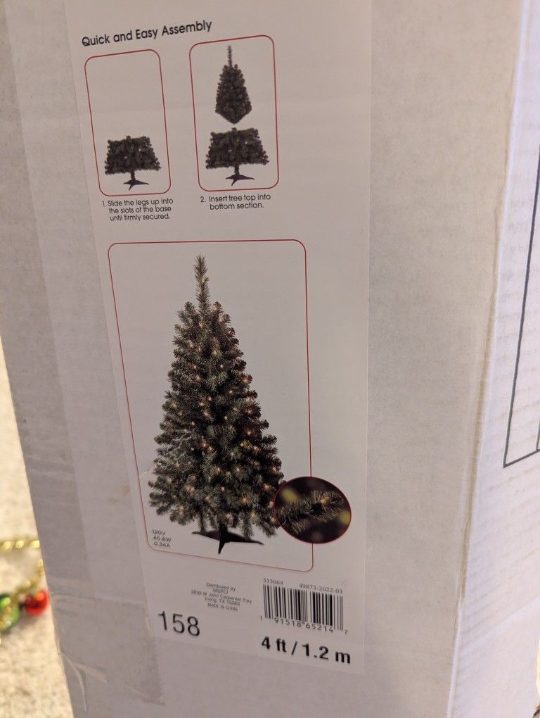 4ft tall Christmas tree with lights built in. Includes all ornaments, tinsel, plus two mini trees for decor!