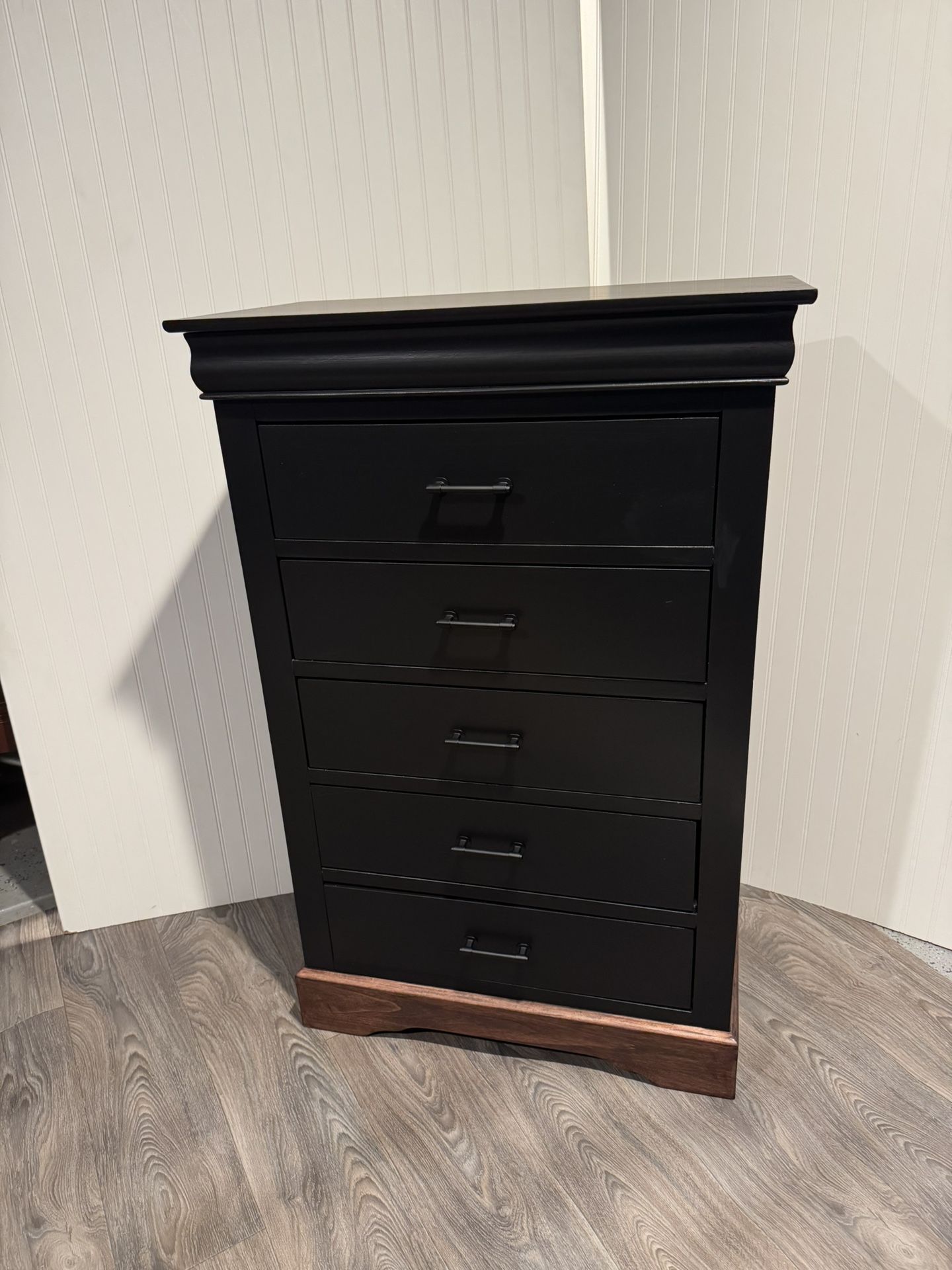 5 drawer dresser black with black pulls. Wood base stained and new liner