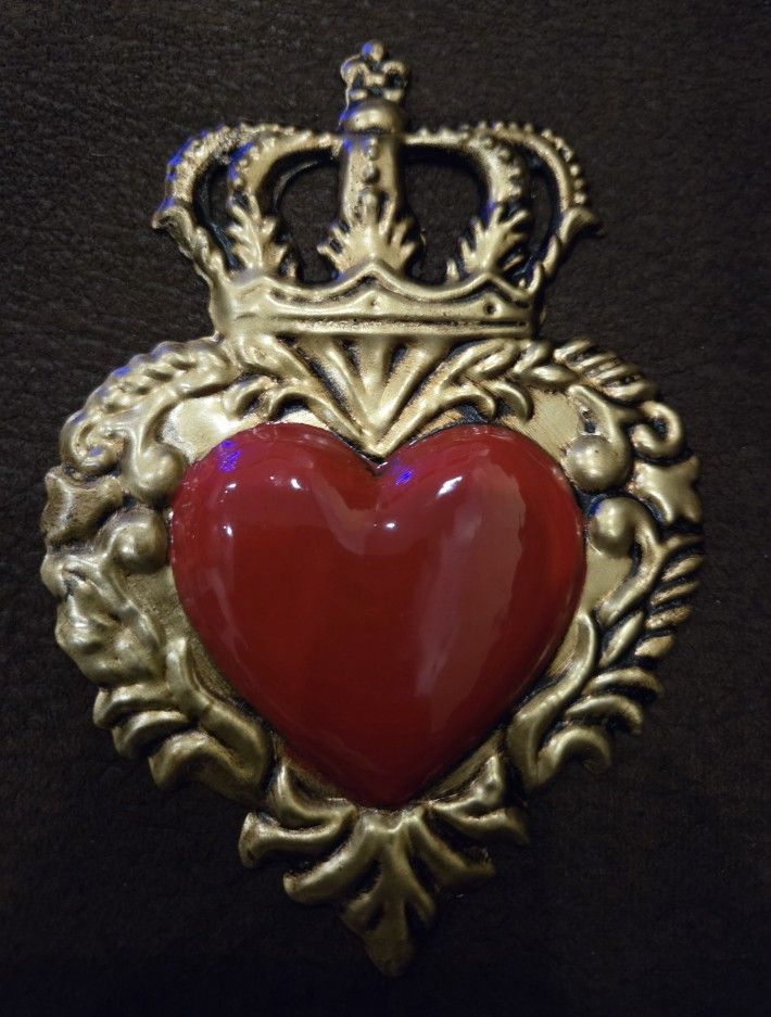 Hand painted Mexican Tin heart with crown, can hang on wall. 5.5"