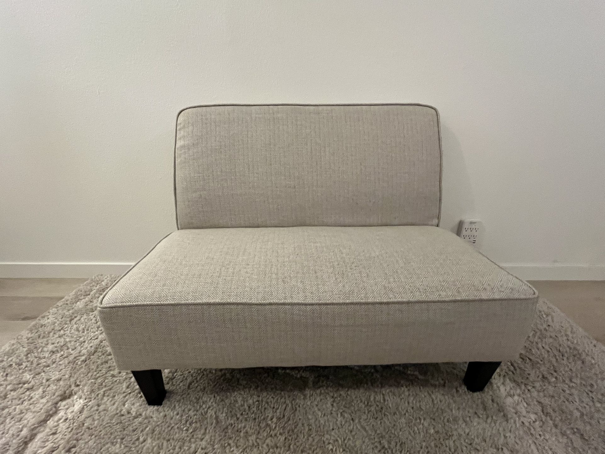 A beige linen fabric armless loveseat in nice condition. Smokeless and non-pet home. Dimensions: 44 inches wide 16 inches tall (seat) 34 inches tall (back) Sold as is. Cash only. Pickup only. Located in Tarzana area 91356 (Reseda and Hatteras St)