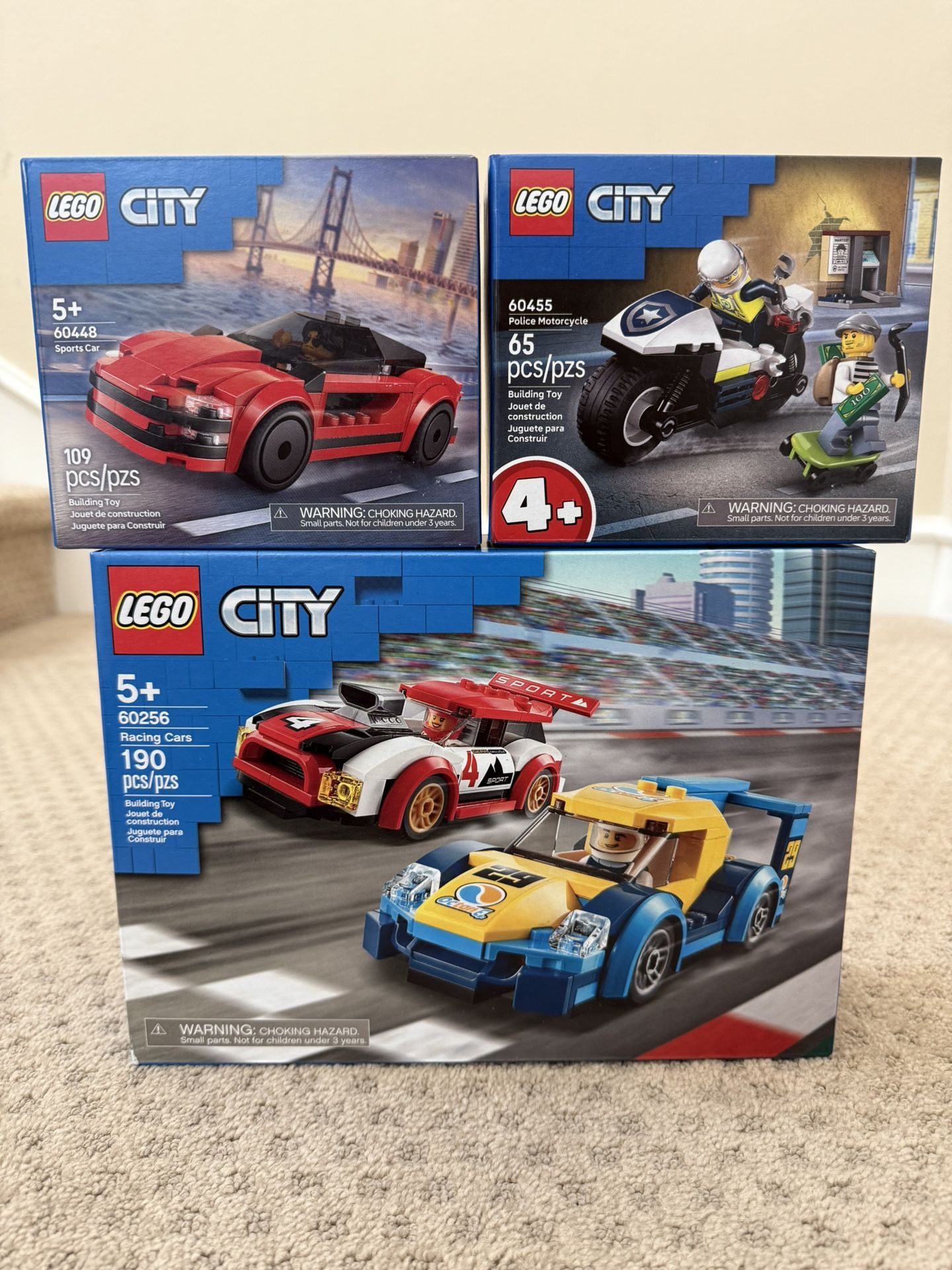 Includes: Lego City Racing Cars 60256 Lego City Sports Car 60448 Lego City Police Motorcycle 60455 Brand new sealed. Pick up in Irvine. Cash only.