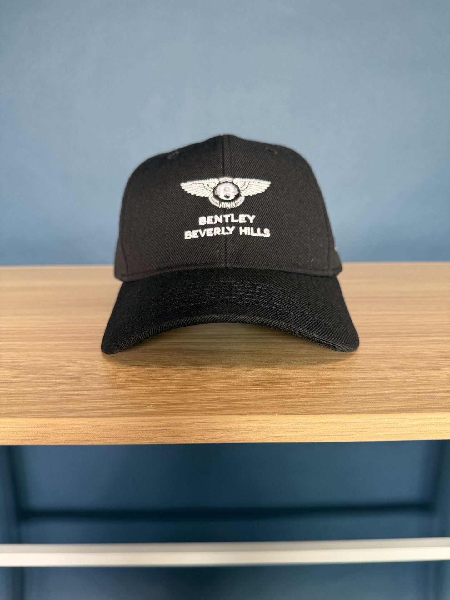 Unisex classic black baseball cap featuring an embroidered Bentley logo. Additional embroidery includes ‘Beverly Hills’ ‘Owner’s Edition’ and ‘G’ (the logo for the dealership) in white. Adjustable Velcro closure. New, never worn. Never had tags - these were made directly for owners.