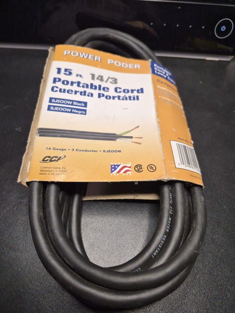 15 Foot 14/3 Power Cord with No Connector Ends. Brand New. Less than 50% Cost.
